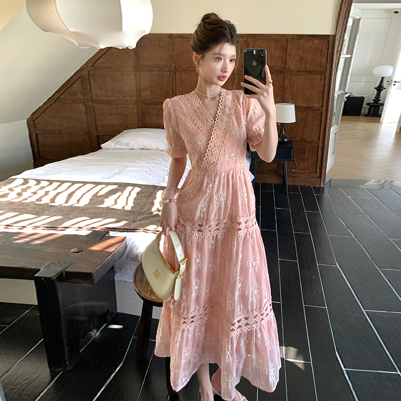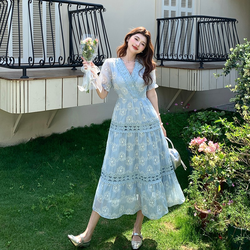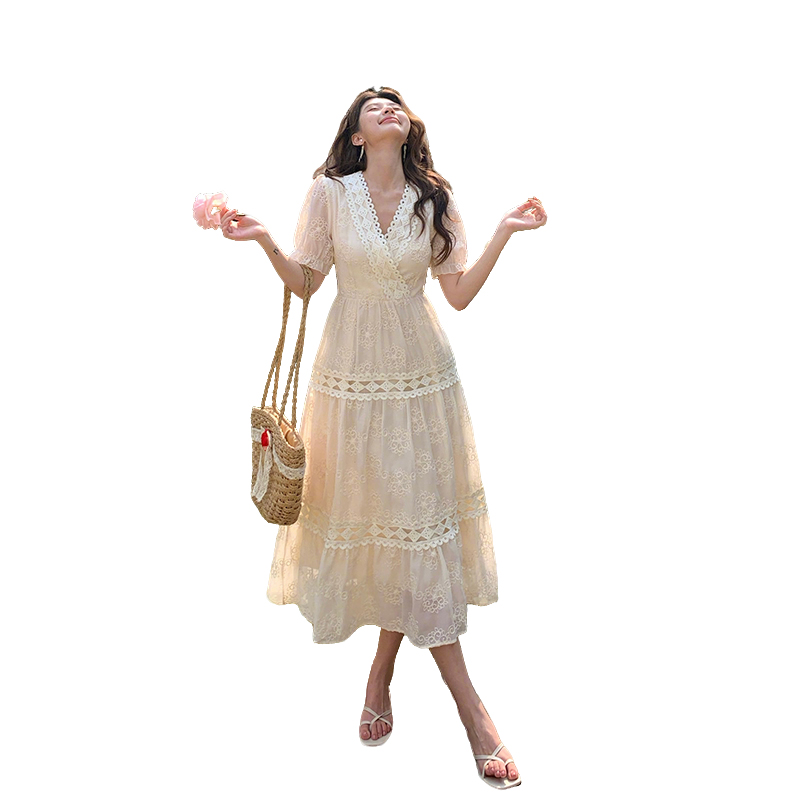 BY17566# 夏季新款法式时尚刺绣拼接V领短袖收腰显瘦连衣裙 服裝批發女裝批發服飾貨源