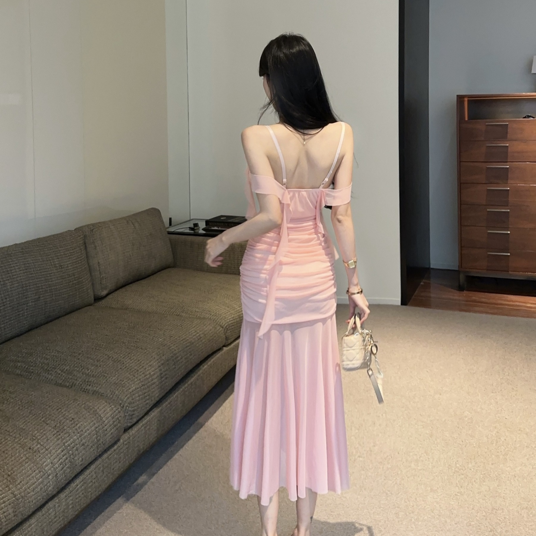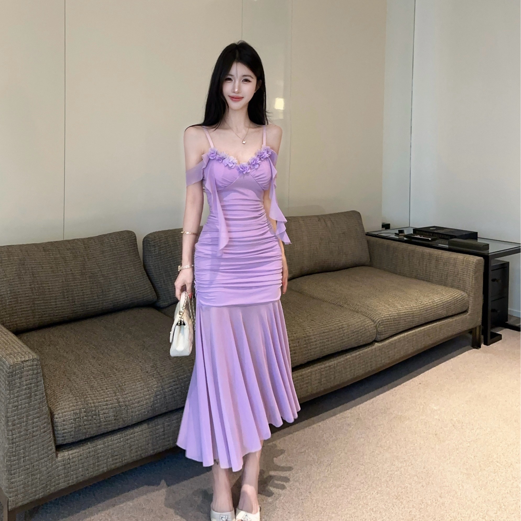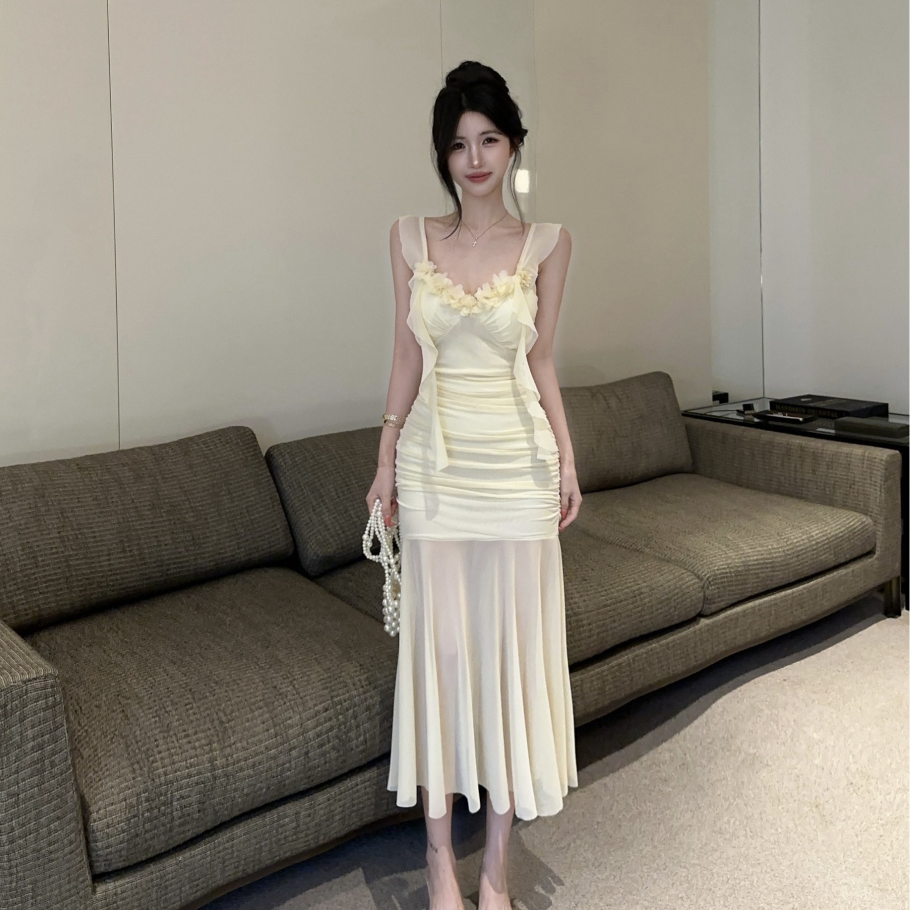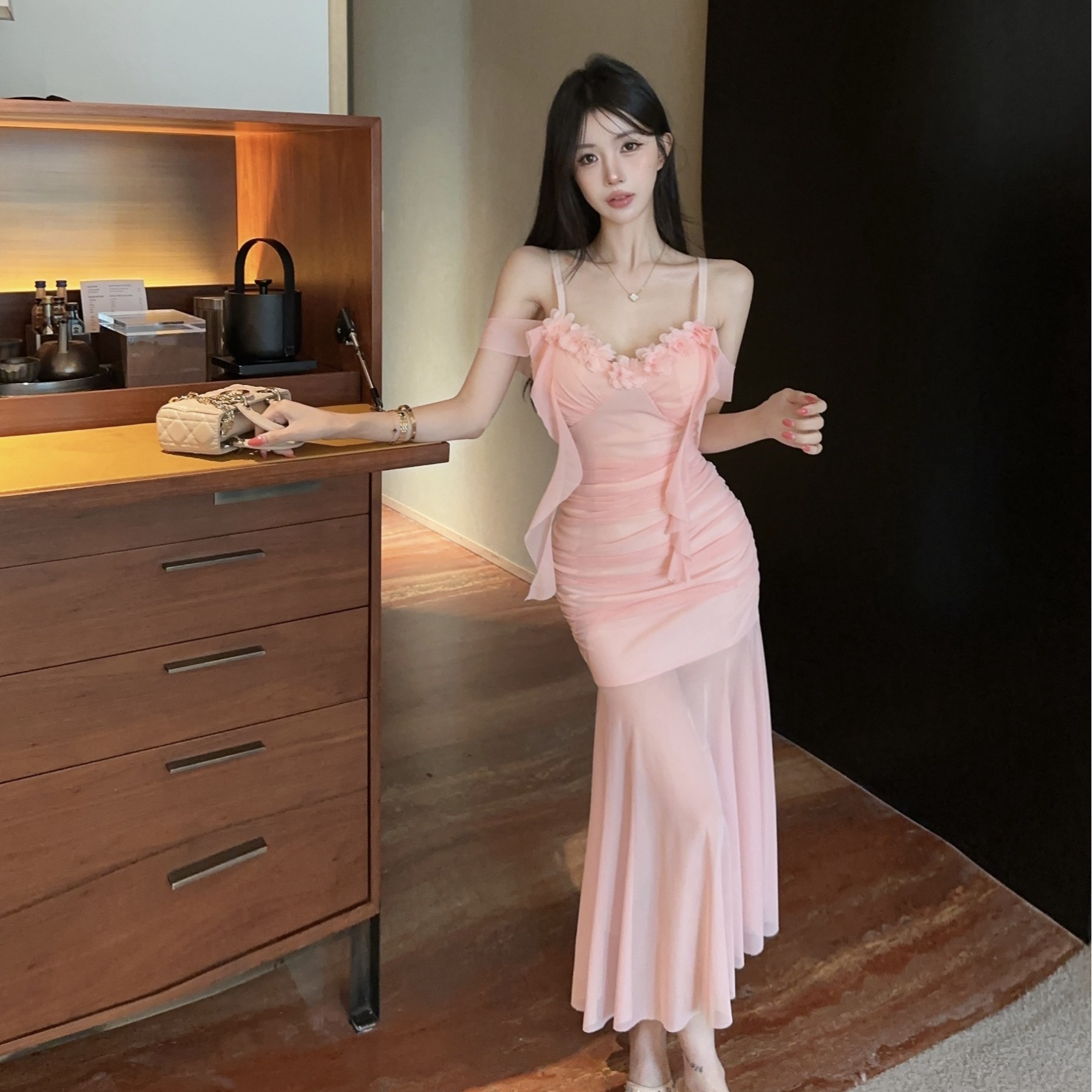 BY17687# 纯欲风立体花吊带连衣裙收腰鱼尾裙约会派对长裙 服裝批發女裝批發服飾貨源