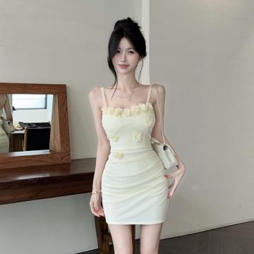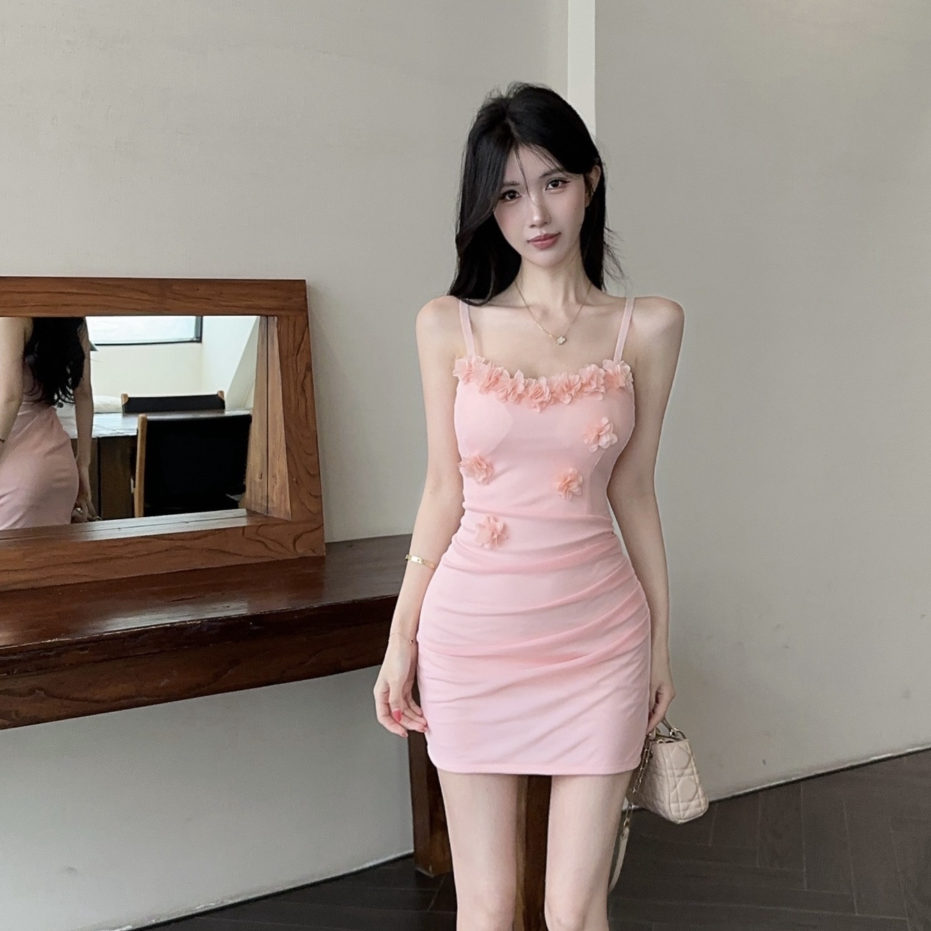 BY17688# 法式立体花吊带连衣裙收腰显瘦包臀裙派对短裙 服裝批發女裝批發服飾貨源