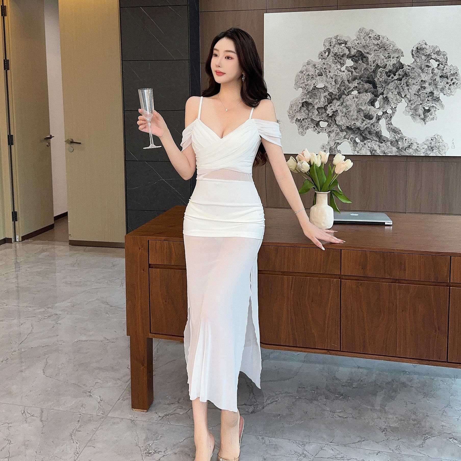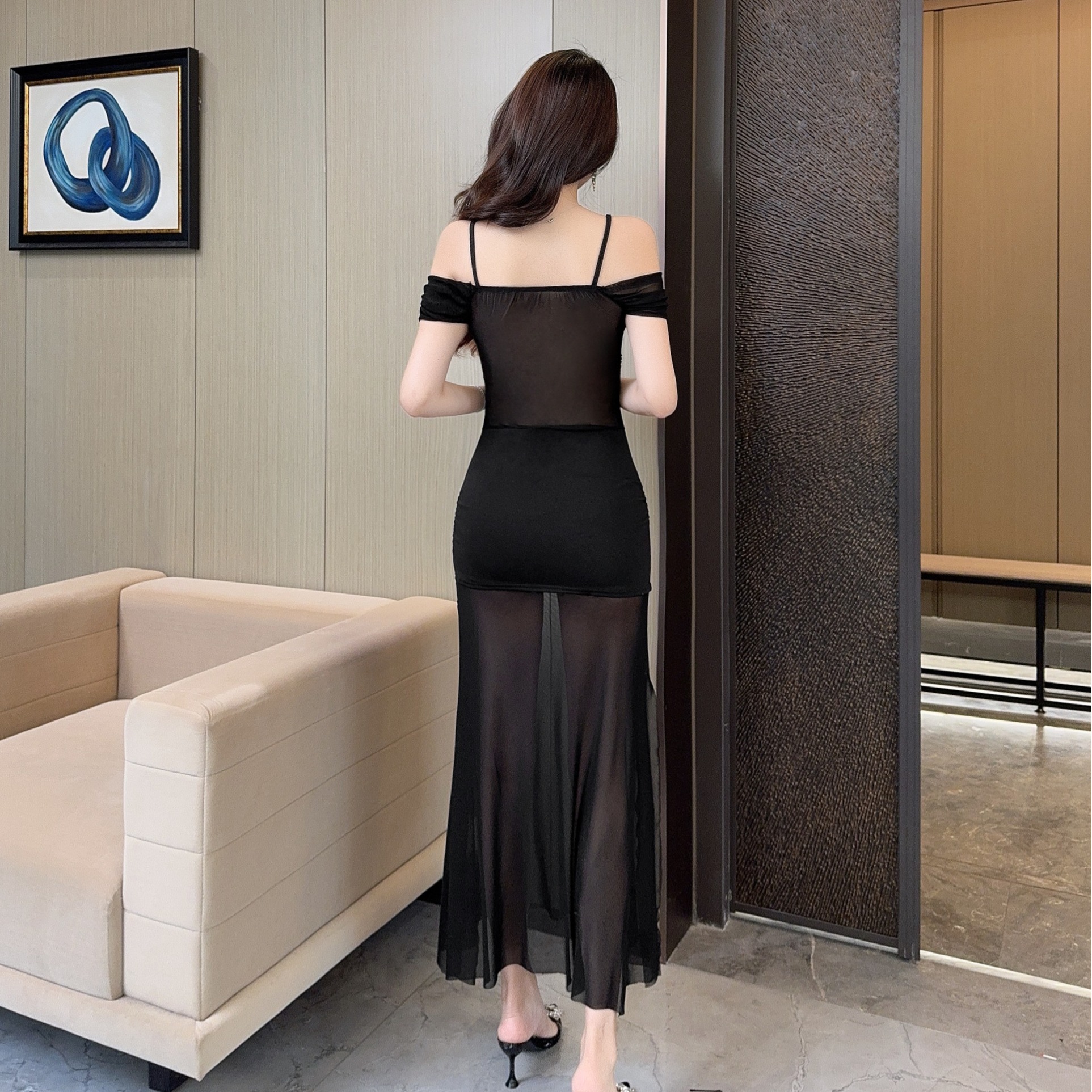 BY17693# 性感纯欲风露肩吊带连衣裙透视收腰显瘦气质派对小礼裙 服裝批發女裝批發服飾貨源