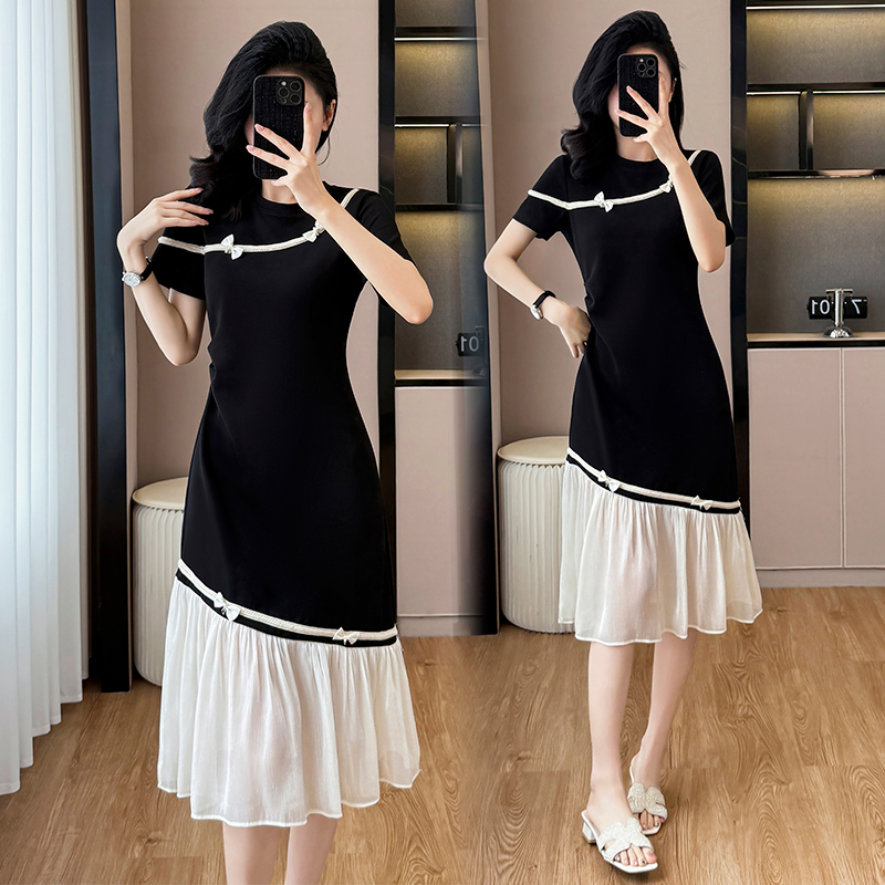 BY17725# 小香风撞色蝴蝶结拼接短袖连衣裙女夏季新款甜美减龄宽松显瘦裙子 服裝批發女裝批發服飾貨源