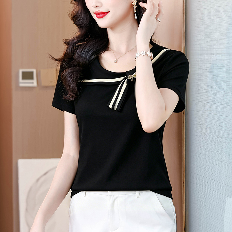 BY17740# 时尚装绑带蝴蝶结短袖T恤衫夏装新款洋气减龄小衫上衣 服裝批發女裝批發服飾貨源