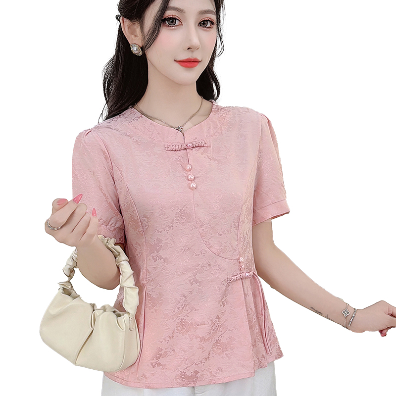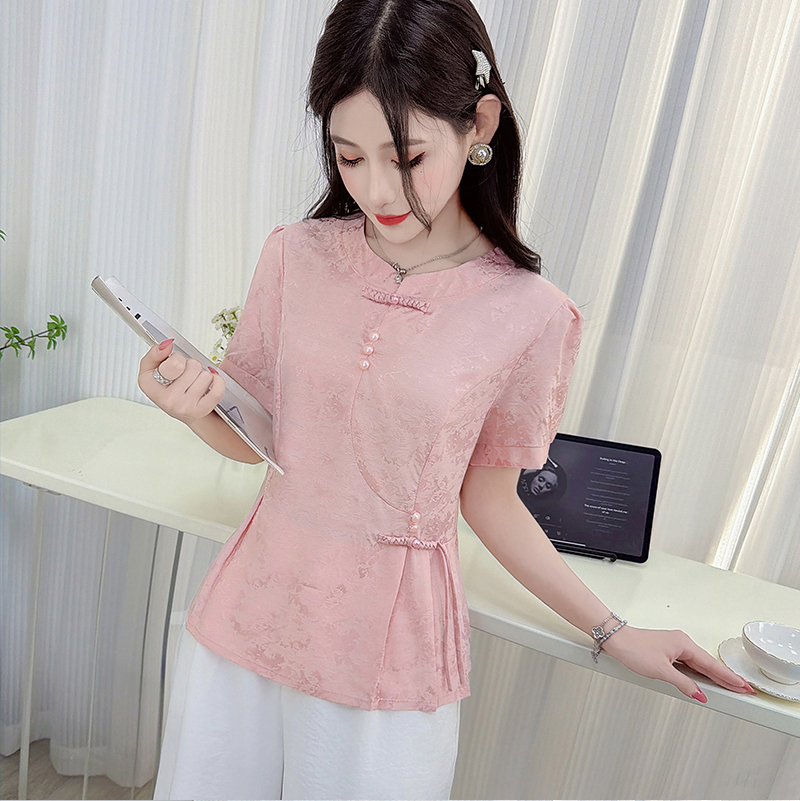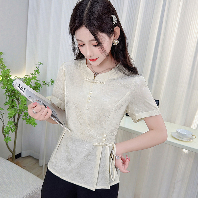 国风衬衫女装短袖收腰小衫夏季新款缎面提花新中式上衣 服裝批發女裝批發服飾貨源