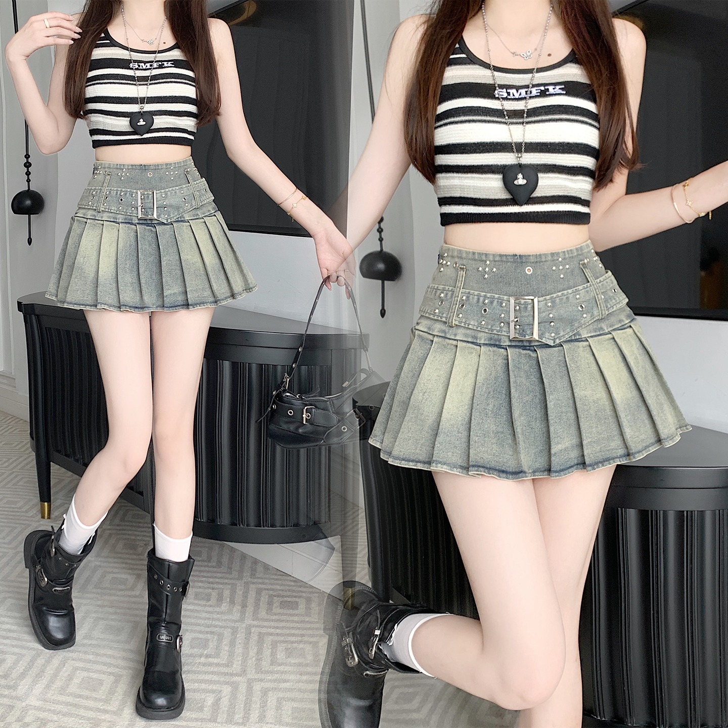 BY17802# 美式纯欲风辣妹设计感弹力牛仔百褶半身裙裤裙 服裝批發女裝批發服飾貨源