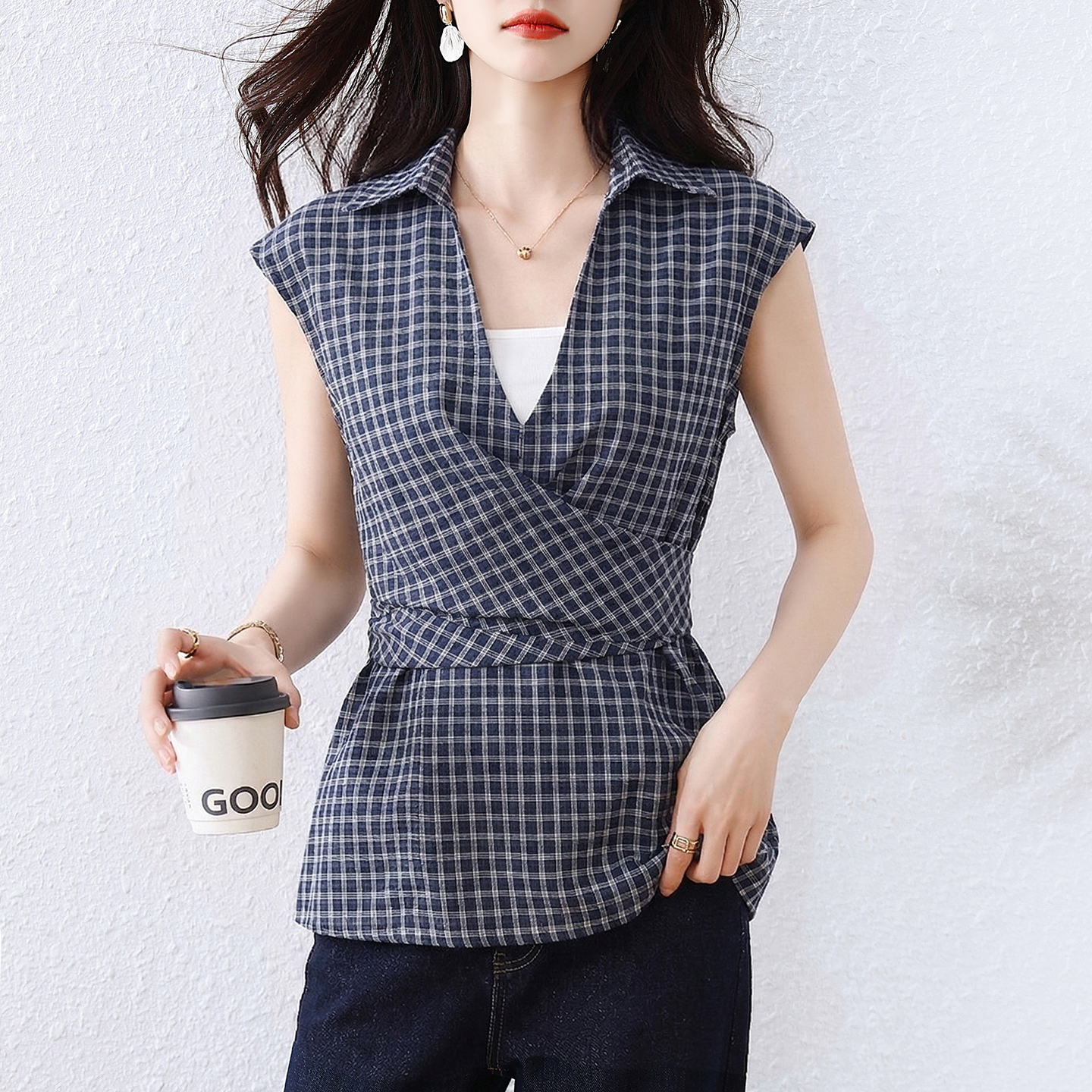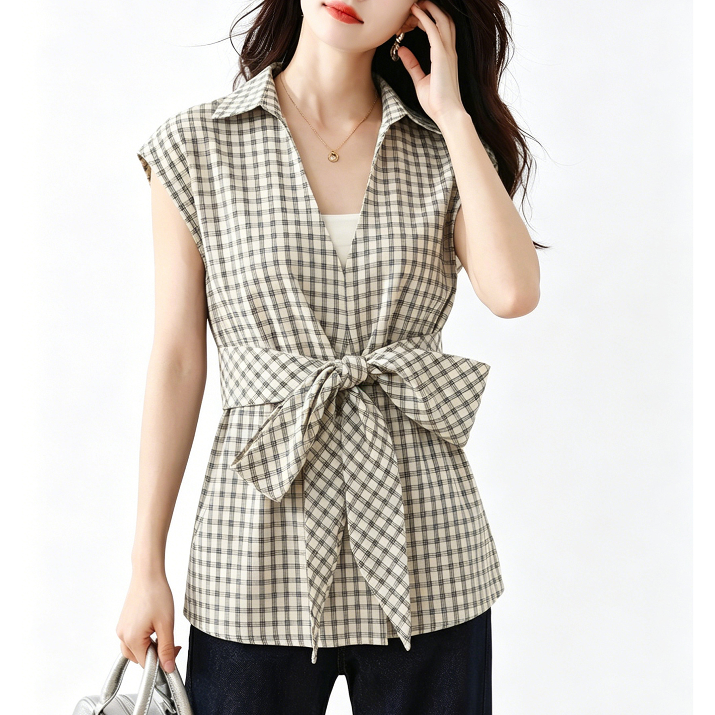 夏季新品格子短袖衬衣收腰系带显瘦遮肉减龄遮肉休闲衬衫 服裝批發女裝批發服飾貨源