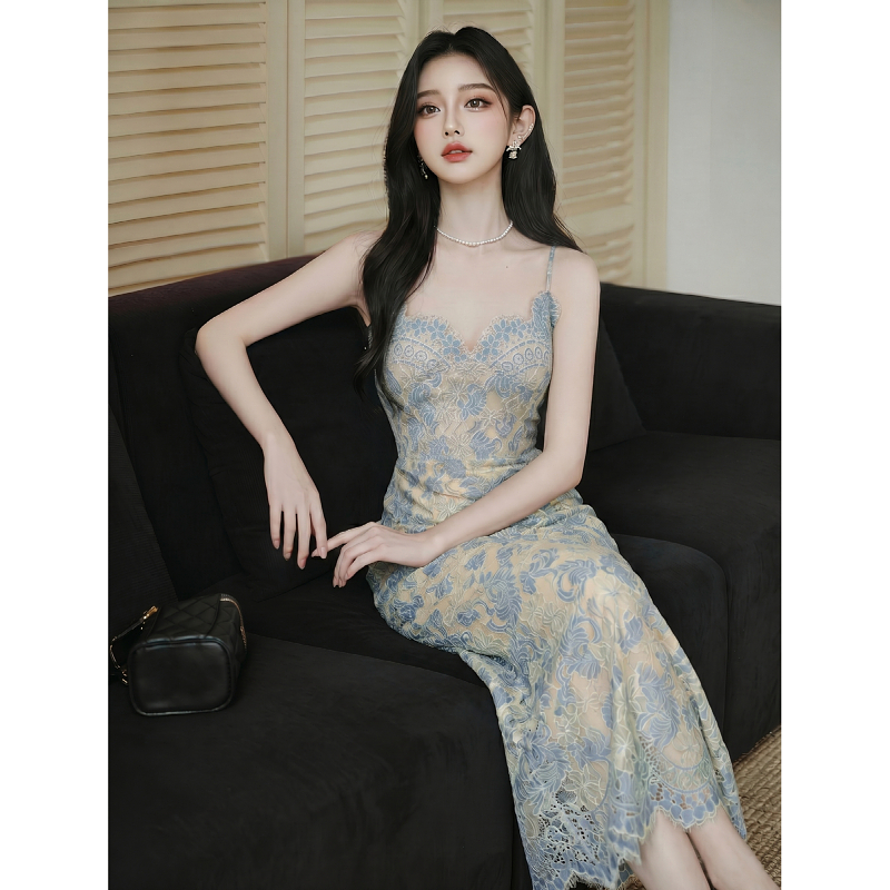 BY17858# 法式性感蕾丝镂空吊带连衣裙女气质收腰包臀显瘦一步裙礼服裙 服裝批發女裝批發服飾貨源