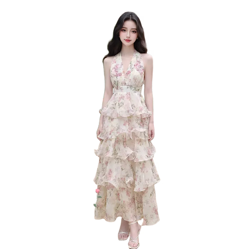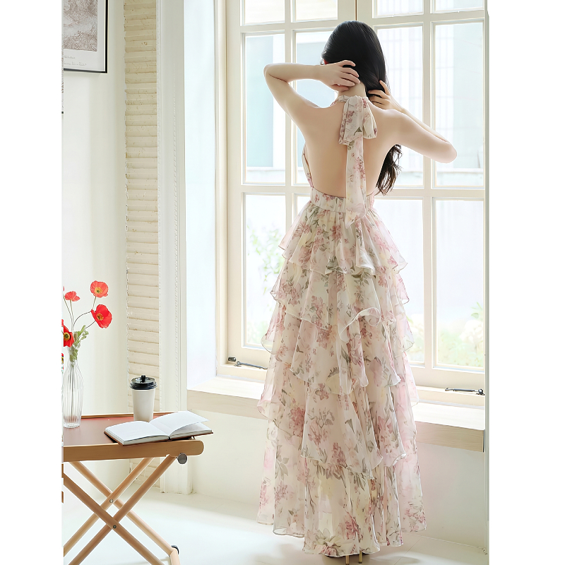 Home > 短袖连衣裙、夜店装 > 法式度假连衣裙女纯欲性感露背挂脖雪纺印花蛋糕长裙生日礼服 服裝批發女裝批發服飾貨源