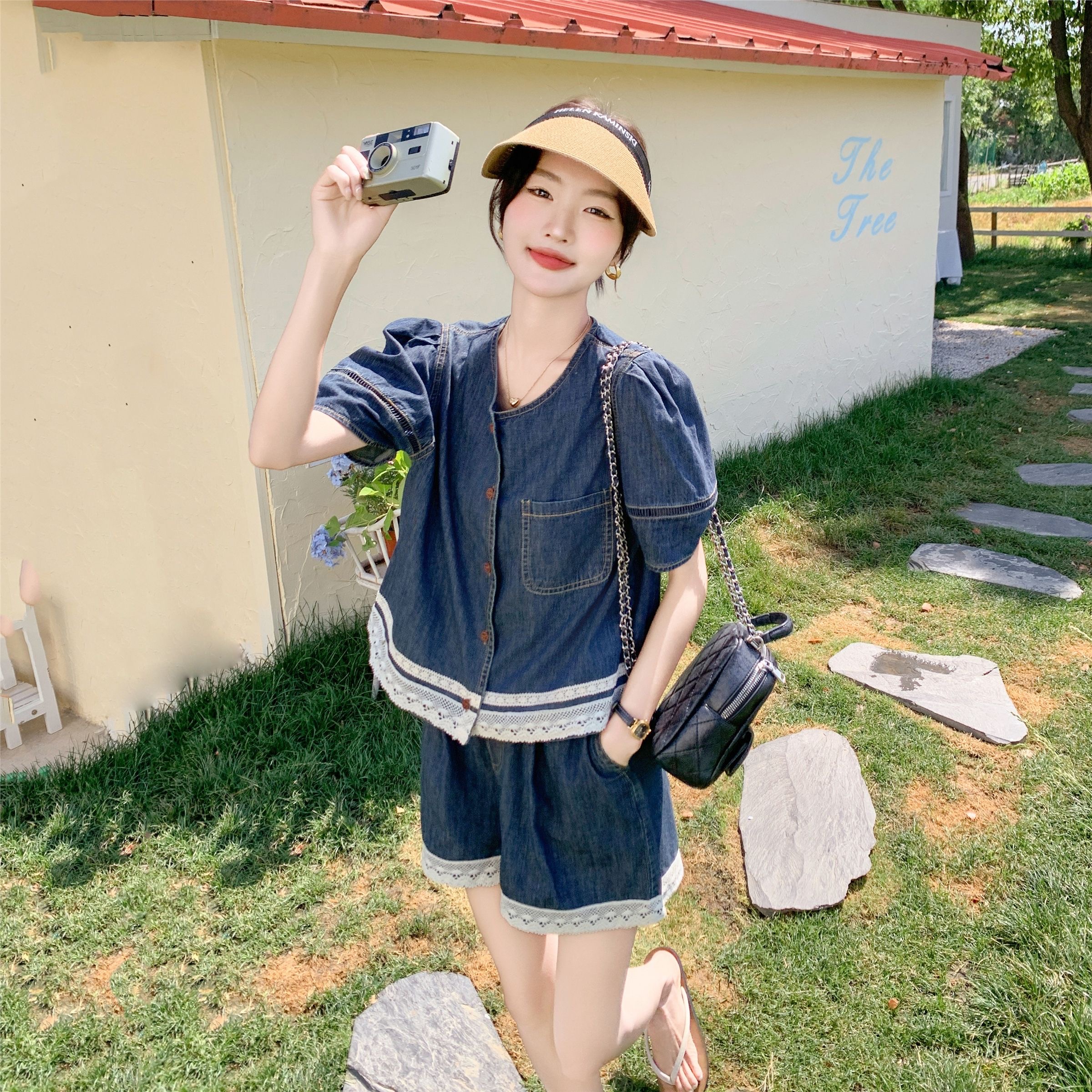 BY18159# 复古炸街减龄今年流行牛仔套装女夏季新款蕾丝拼接短裤两件套 服裝批發女裝批發服飾貨源