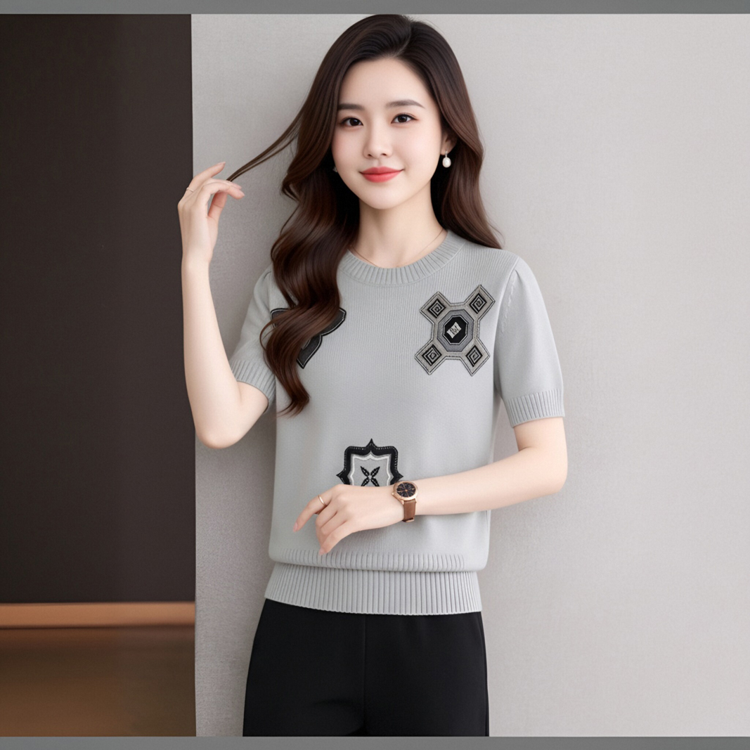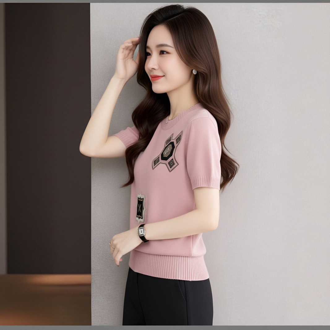 BY18586# 夏季新款复古翻领短袖针织衫女彩色扣子刺绣花朵深蓝色上衣潮 服裝批發女裝批發服飾貨源