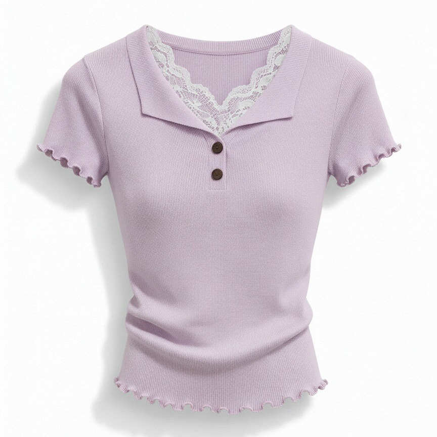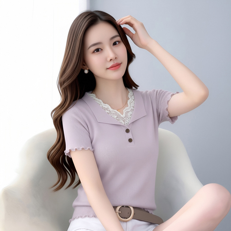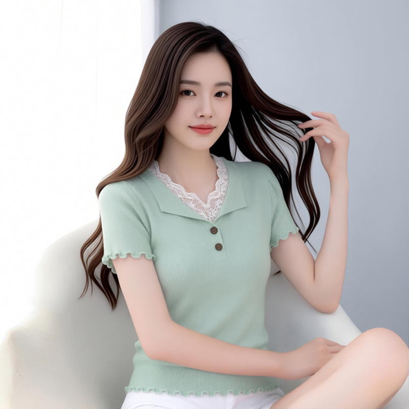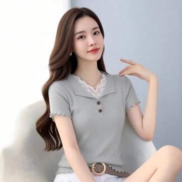BY18589# 夏季蕾丝拼接木耳边v领冰丝针织短袖t恤女设计感辣妹修身绝美上衣 服裝批發女裝批發服飾貨源