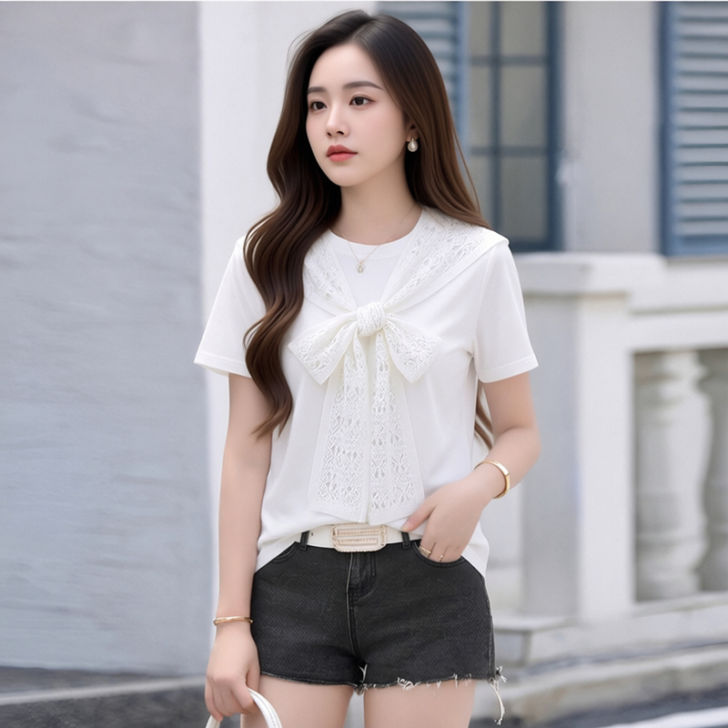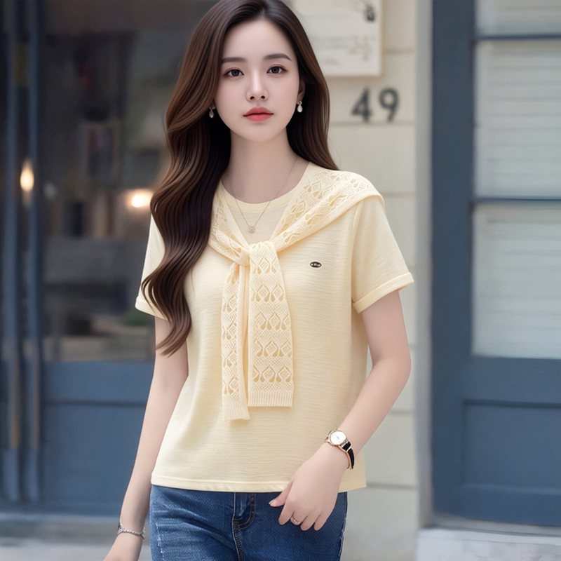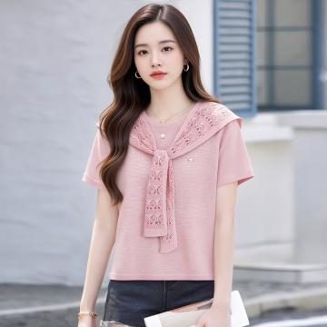 BY18590# 海军风披肩短袖针织衫冰丝T恤女夏通勤气质上衣 服裝批發女裝批發服飾貨源