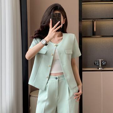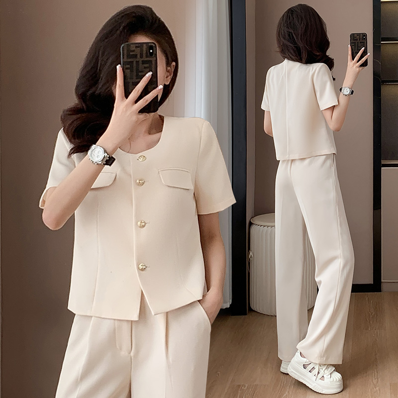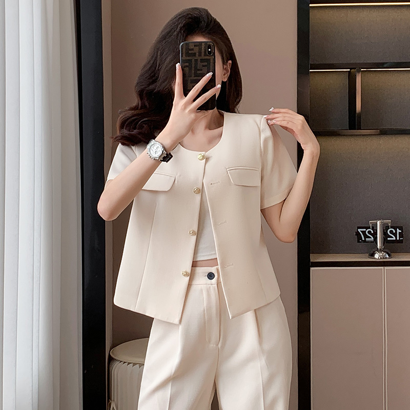 BY18619# 米色短袖西装套装女夏季新款无领设计感短款西服喇叭裤两件套 服裝批發女裝批發服飾貨源