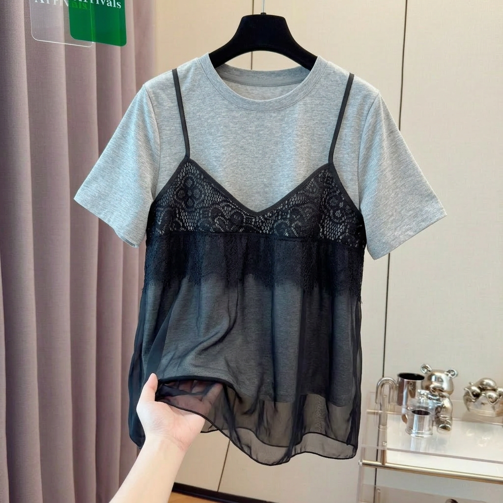 BY18660# 大码法式蕾丝钩花吊带拼接假两件短袖T恤女夏季胖mm宽松上衣 服裝批發女裝批發服飾貨源