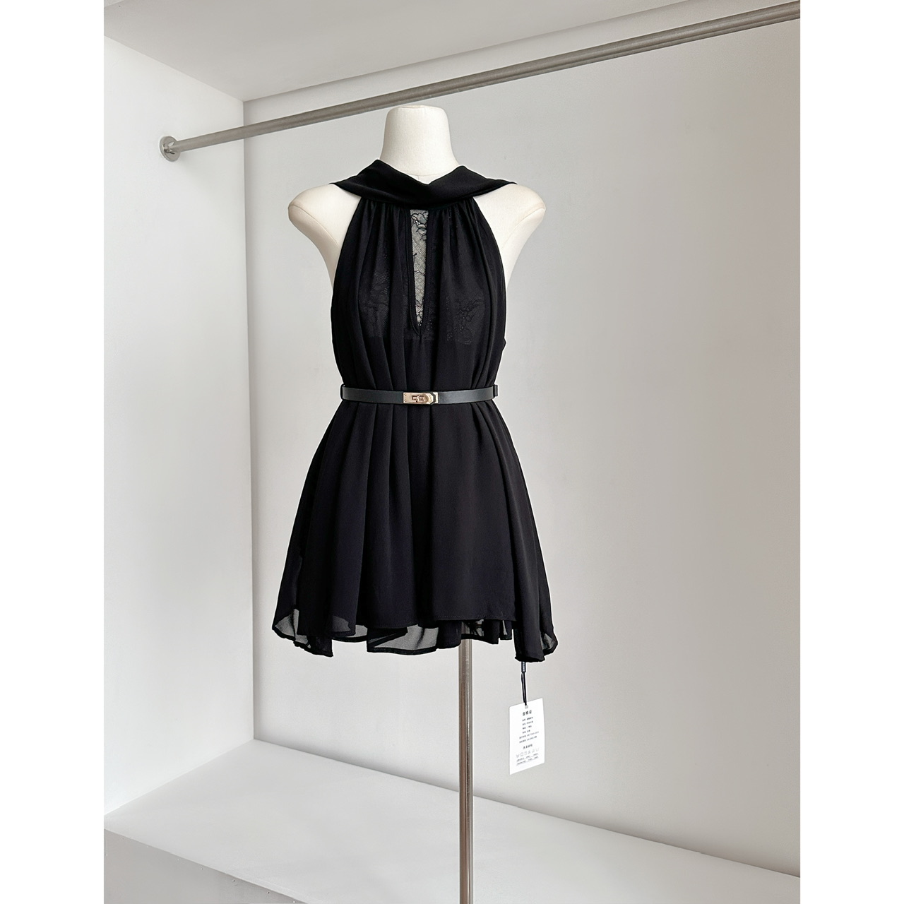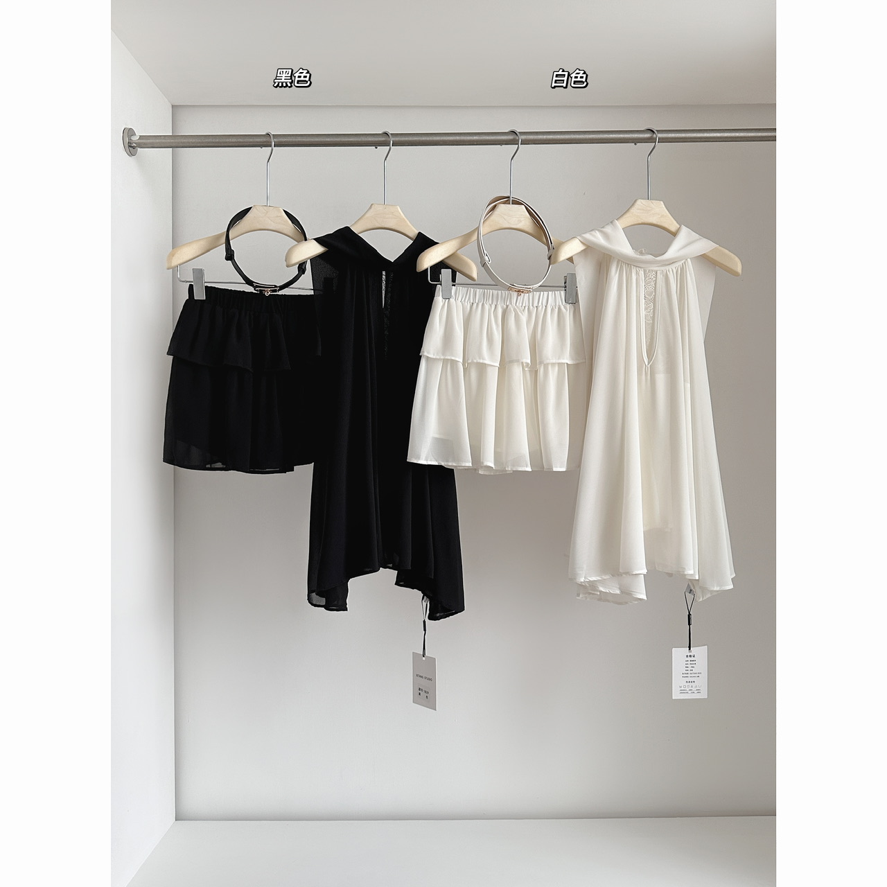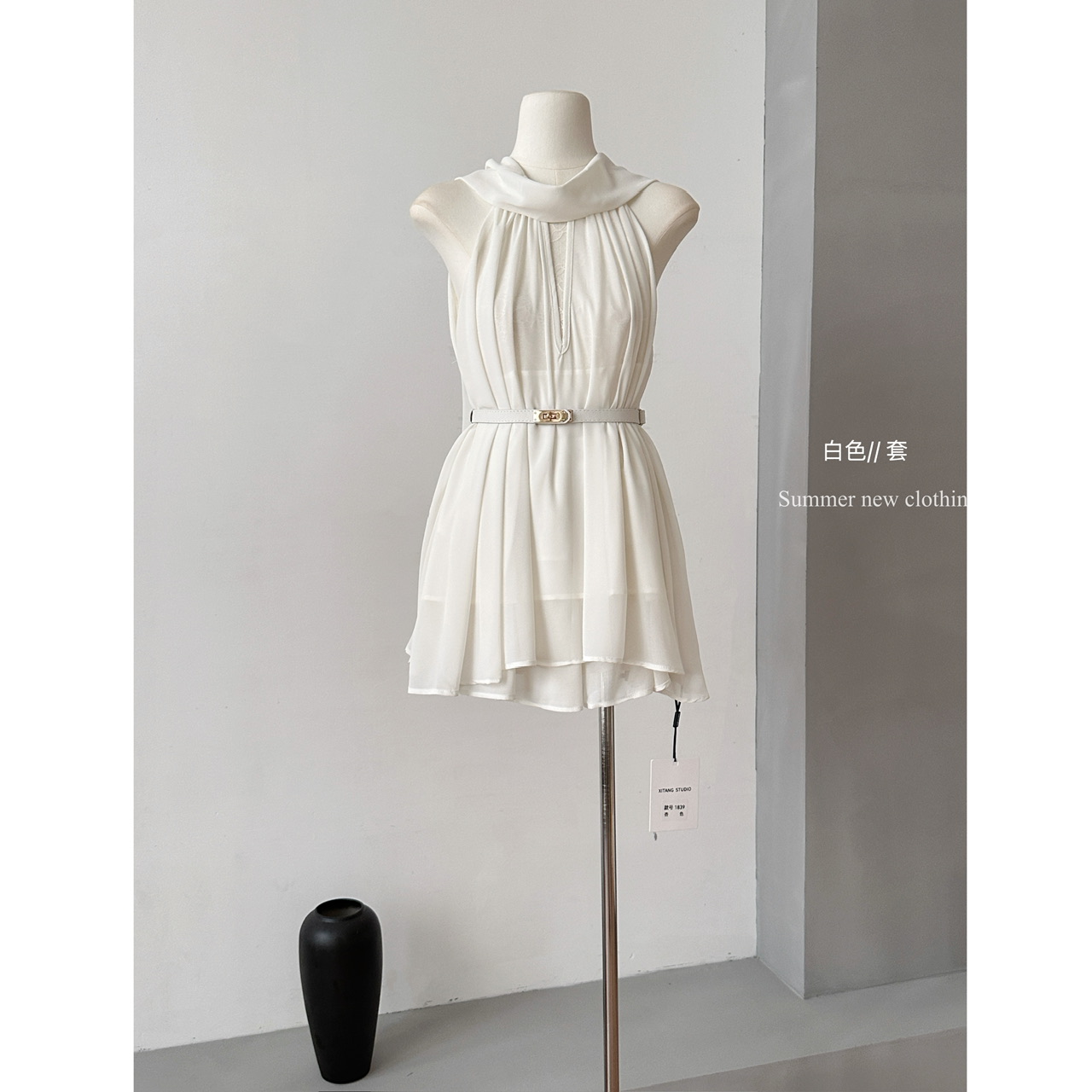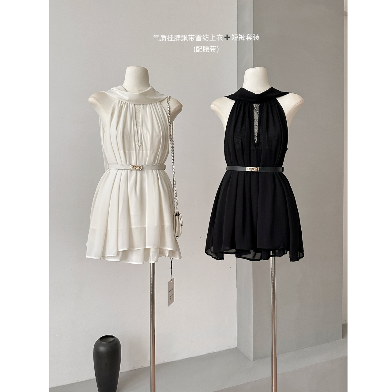 BY18668# 夏季新款女神挂脖飘带雪纺上衣+短裤套装配腰带 服裝批發女裝批發服飾貨源