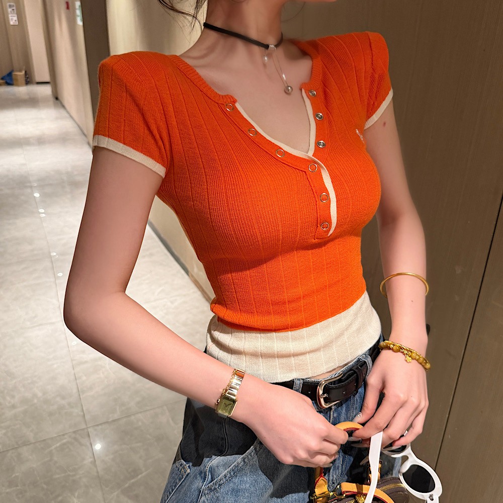 BY18705# 夏季新款时尚百搭设计感撞色拼接纽扣V领短袖针织上衣女 服裝批發女裝批發服飾貨源