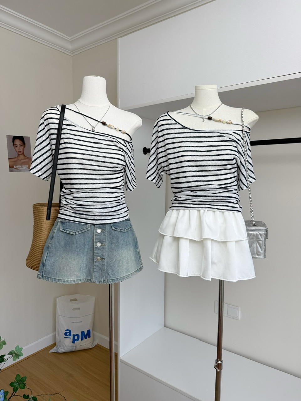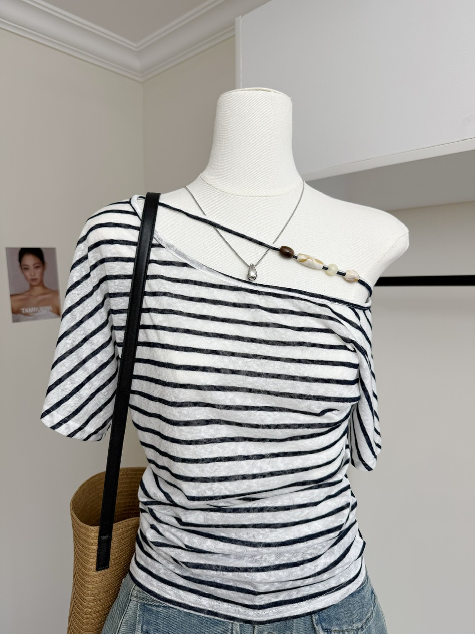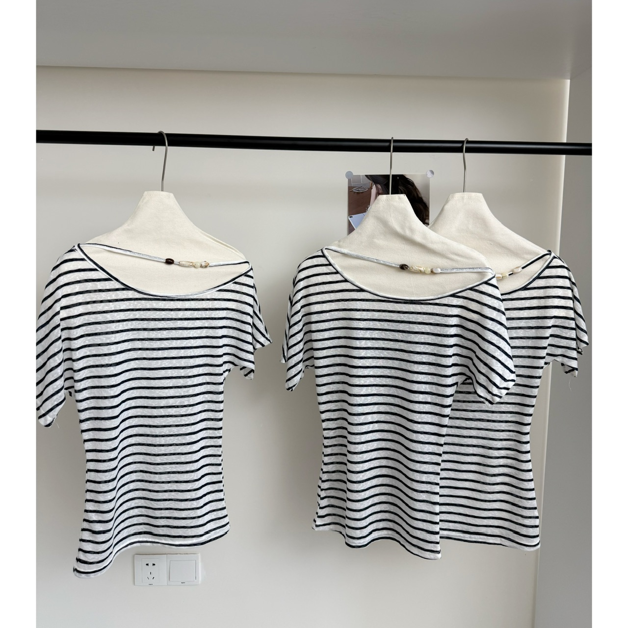 FA34813# 8uioio迷雾丁香斜领露肩T恤女夏季新款设计感条纹修身上衣 服裝批發女裝批發服飾貨源