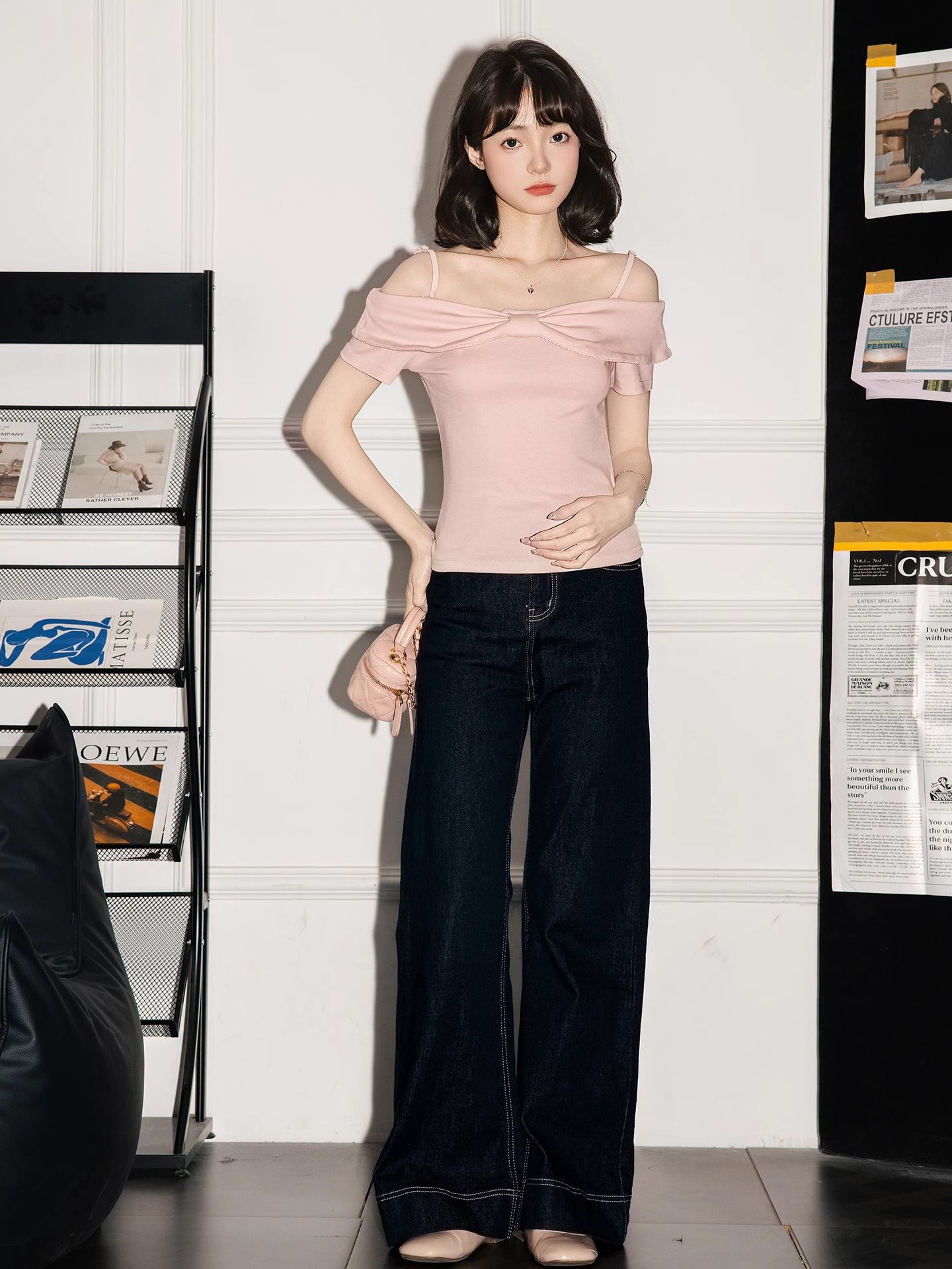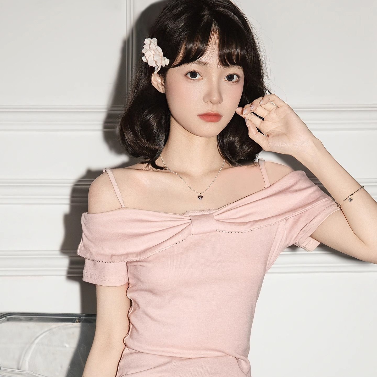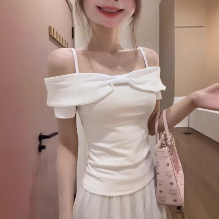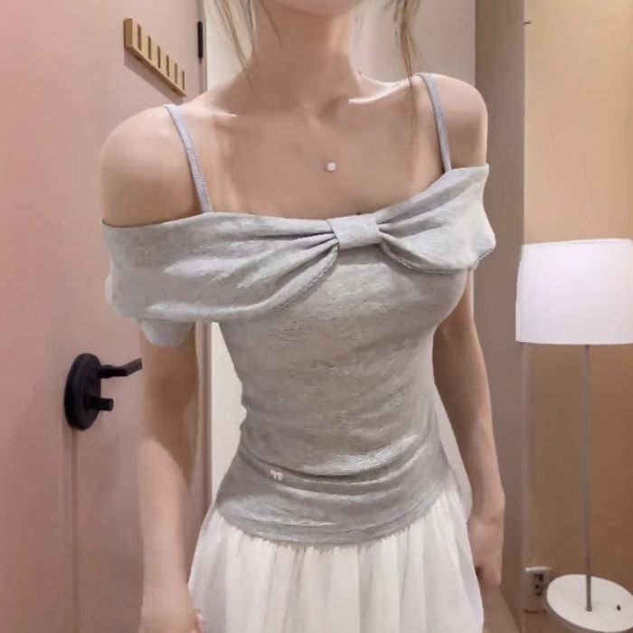 FA35454# 纯棉1*1新款纯欲风一字肩蝴蝶结系带修身显瘦上衣女 服裝批發女裝批發服飾貨源