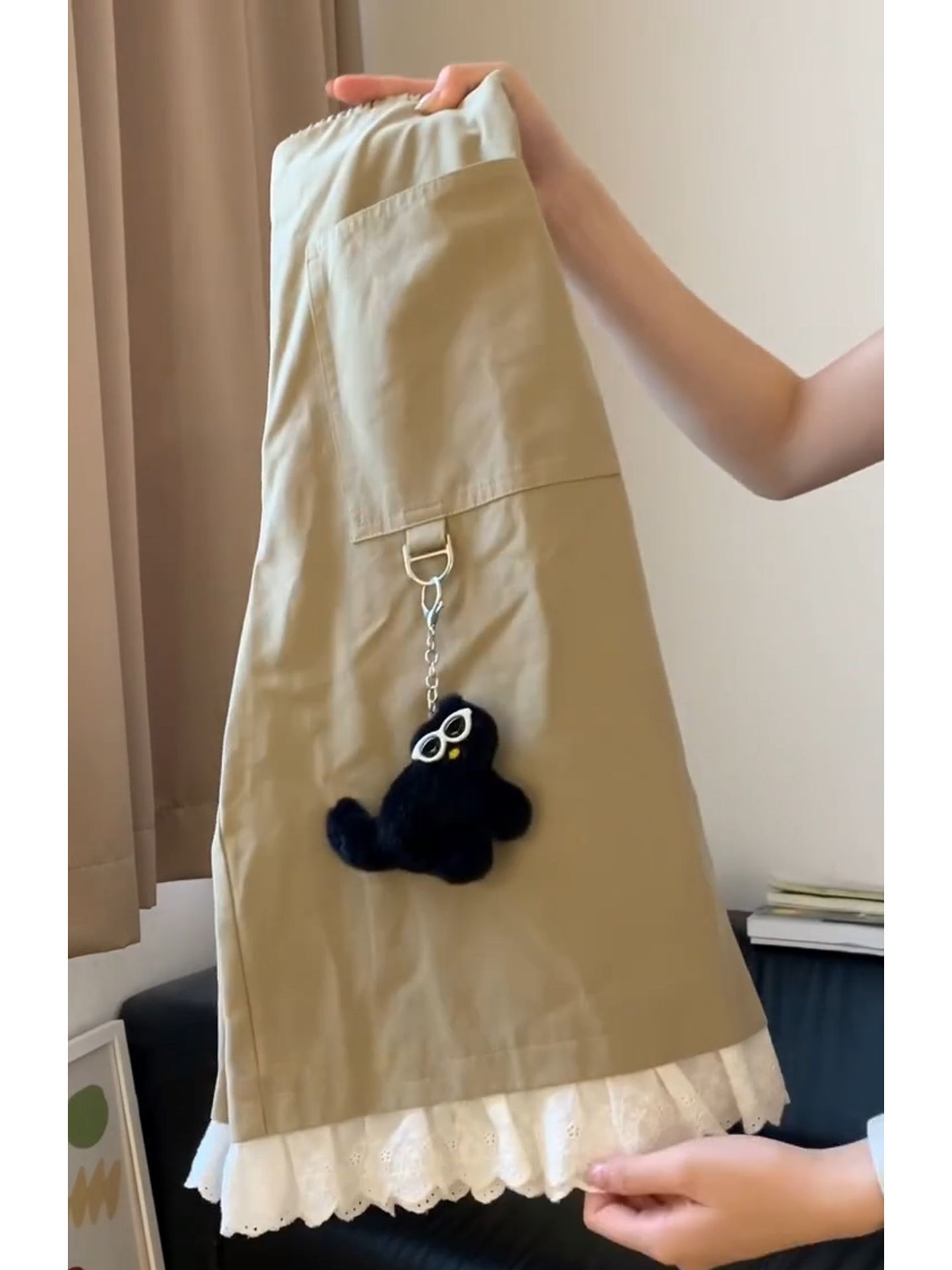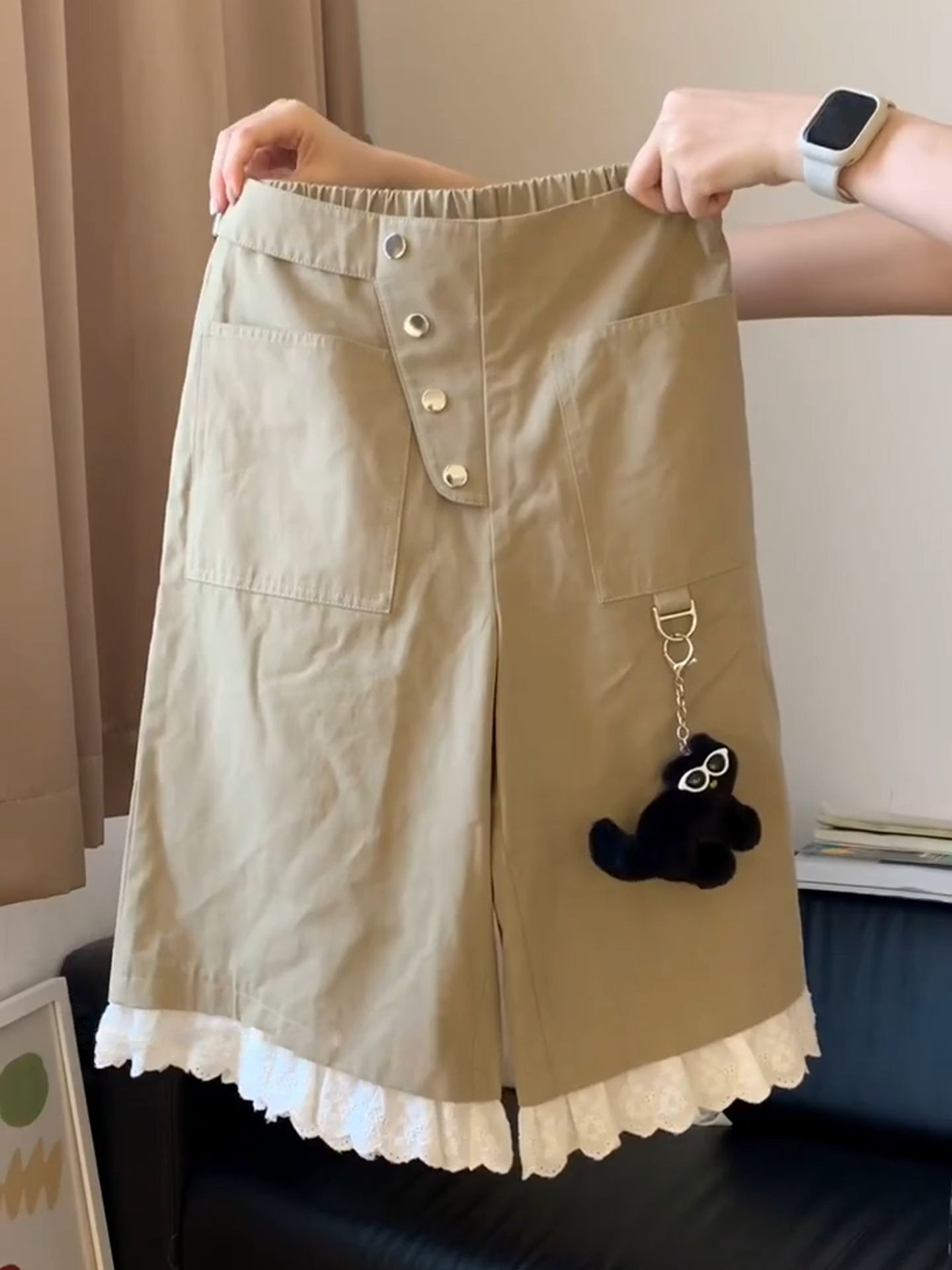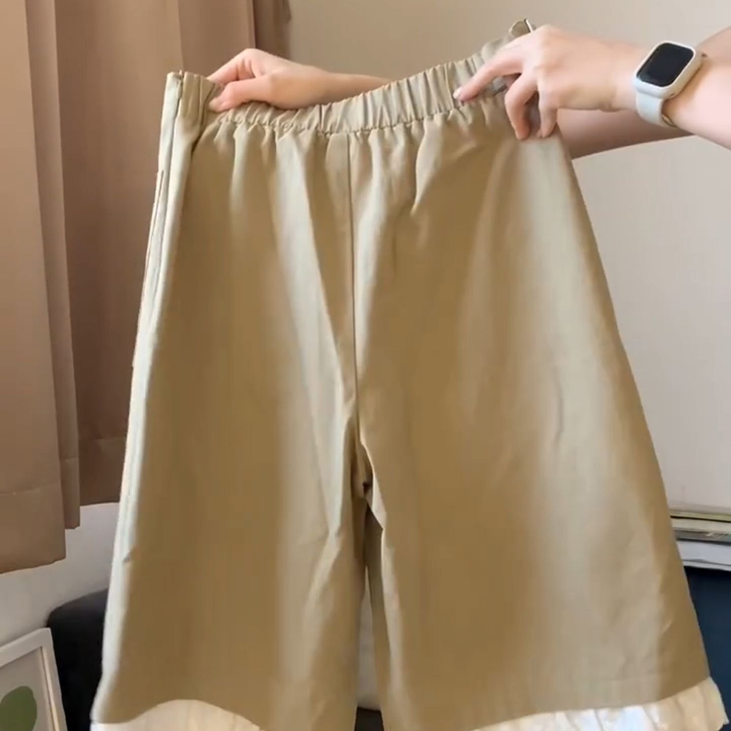 FA35459# 卡其色蕾丝花边拼接高腰直筒五分休闲裤女夏小众阔腿中裤 服裝批發女裝批發服飾貨源