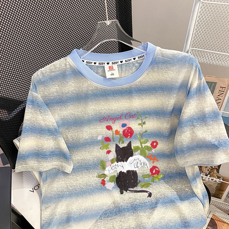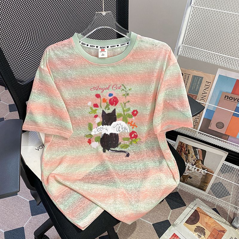 FA35462# 原版质量+罗纹领+包边拉肩特大码300斤条纹短袖t恤女 服裝批發女裝批發服飾貨源