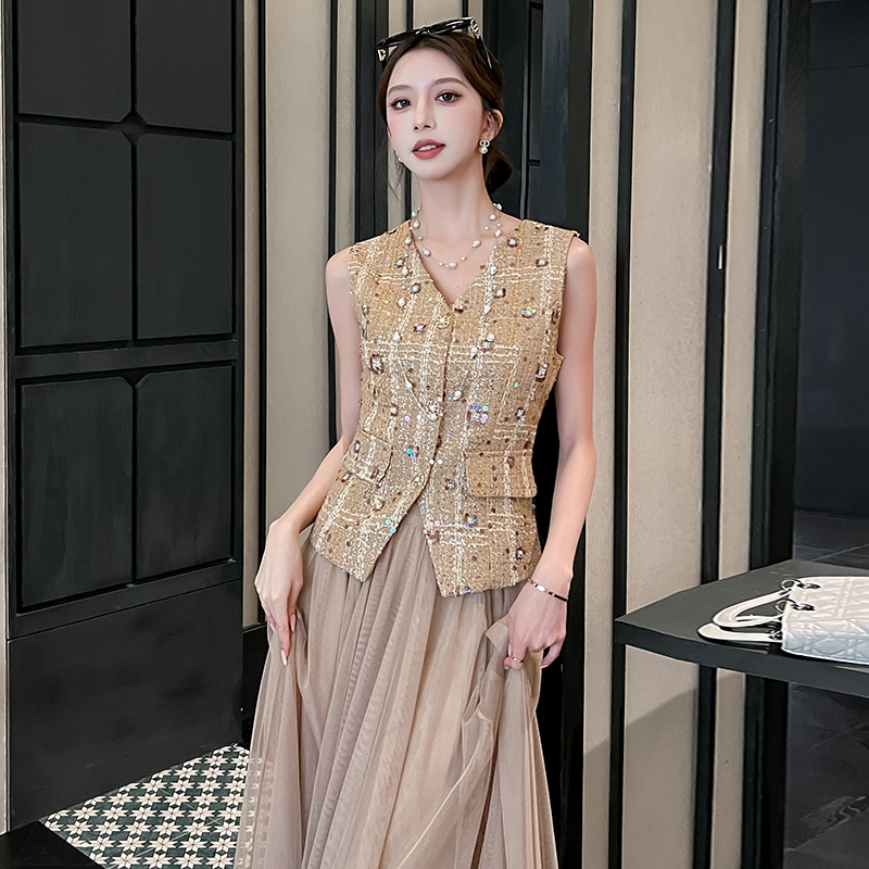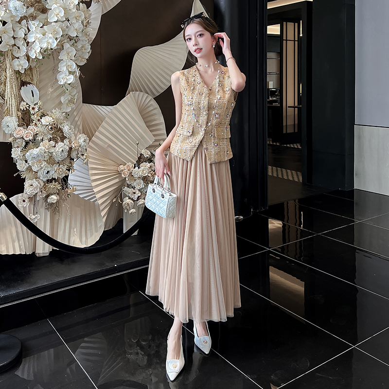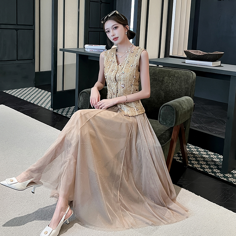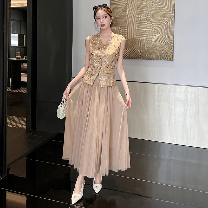 FA39573# 秋季新款法式名媛重工亮片小香风马甲+长纱裙半身裙套装 服裝批發女裝批發服飾貨源
