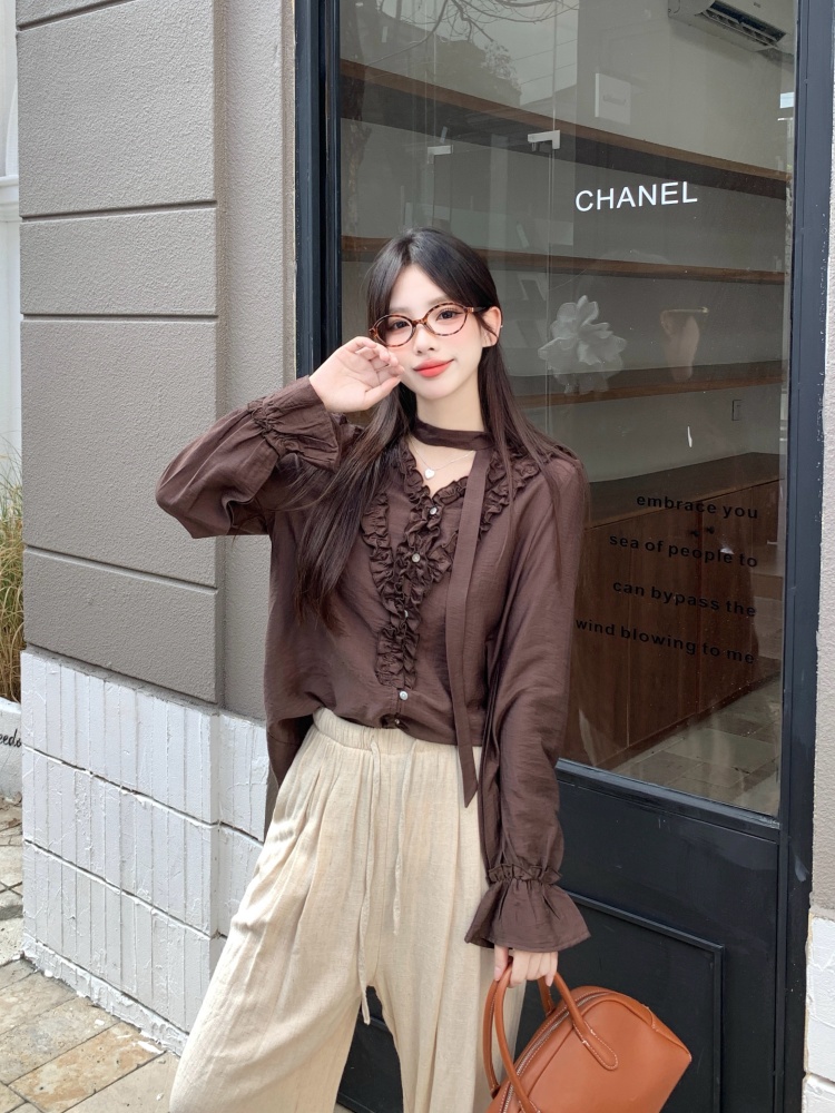 FA42111# 咖色木耳边系带长袖衬衫胖mm秋季新款高级感法式小众上衣