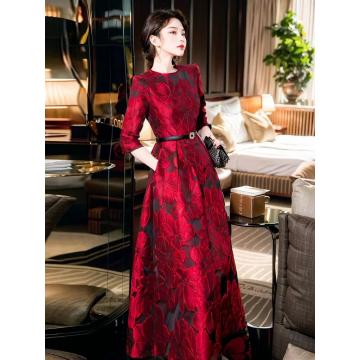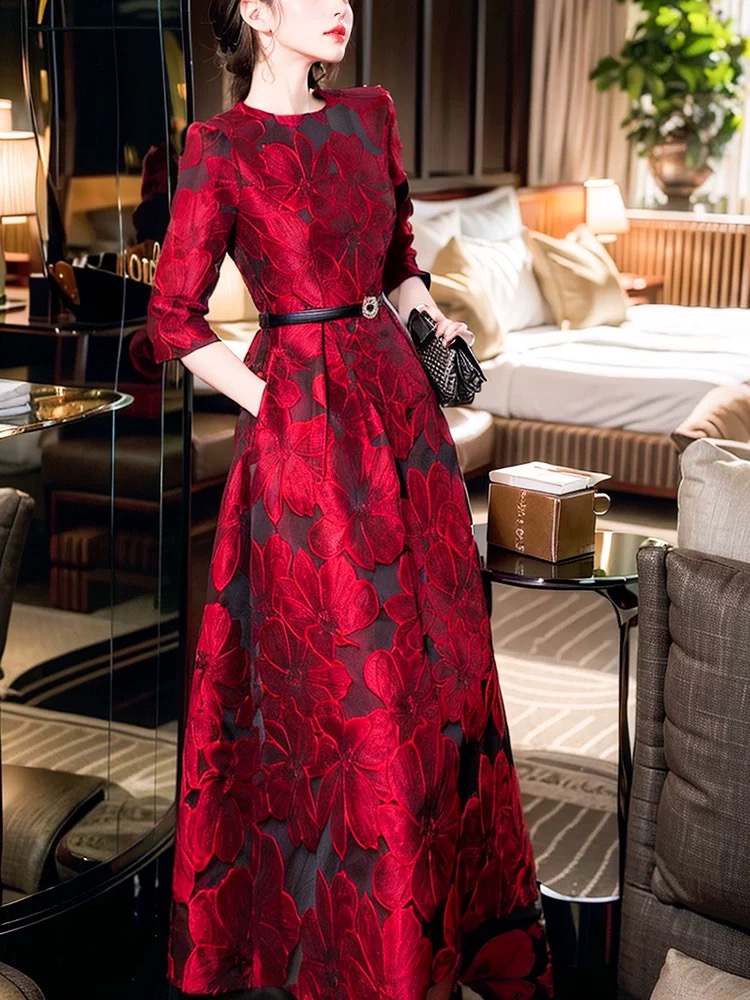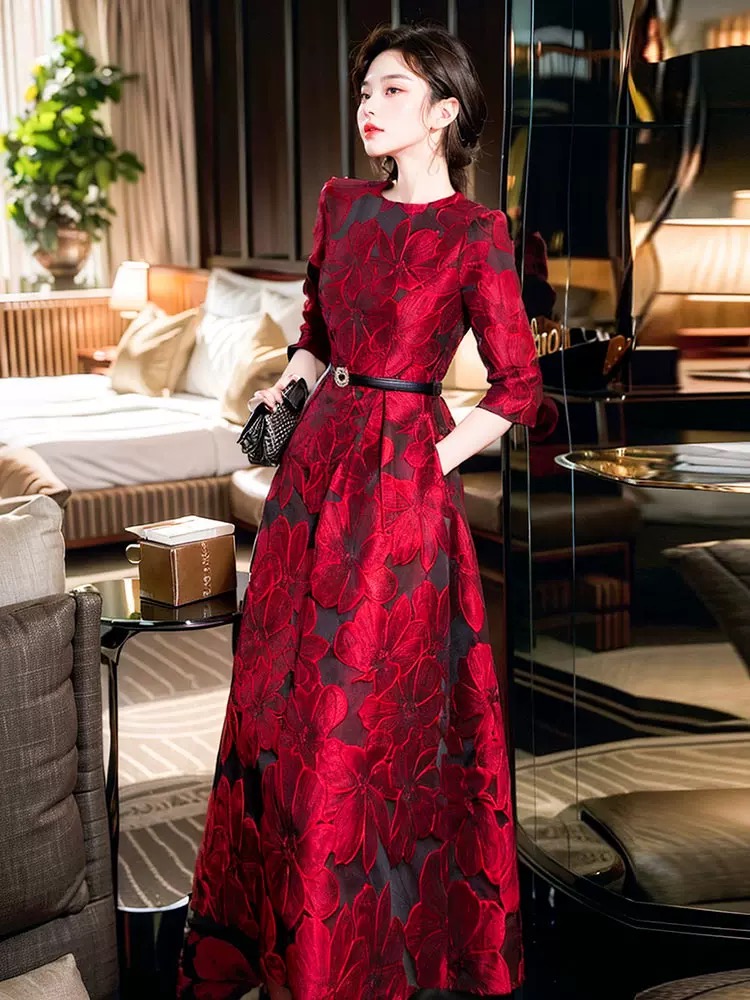 FA42509# 春秋富家千金高级感穿搭立体花朵提花酒红色七分袖连衣裙 服裝批發女裝批發服飾貨源