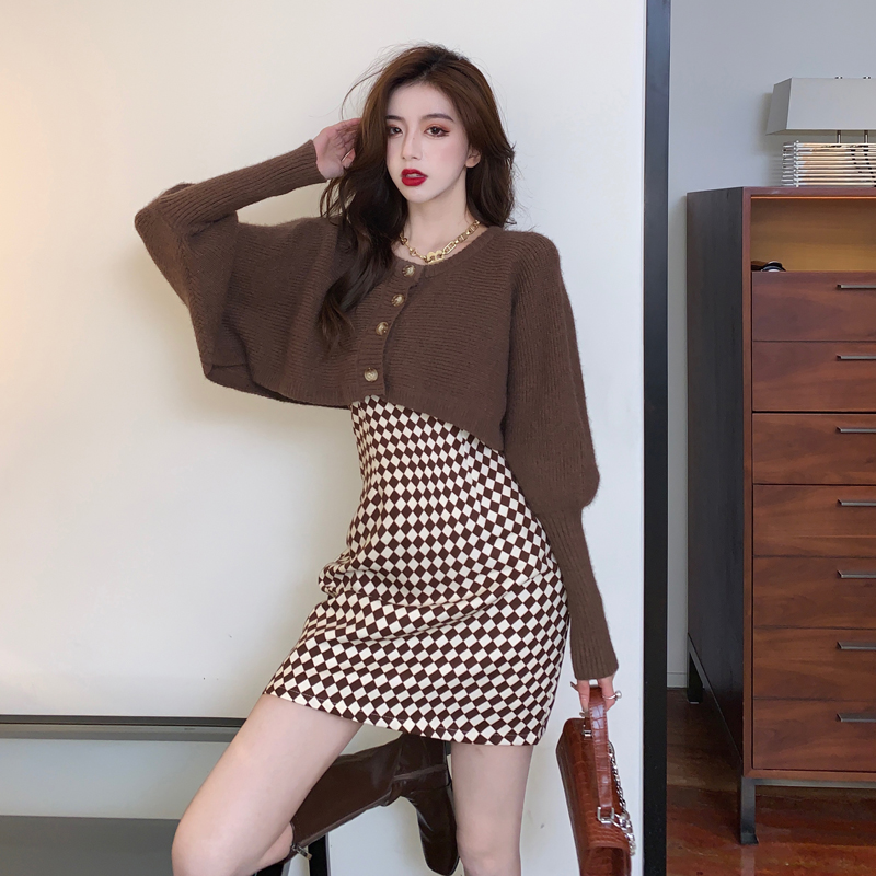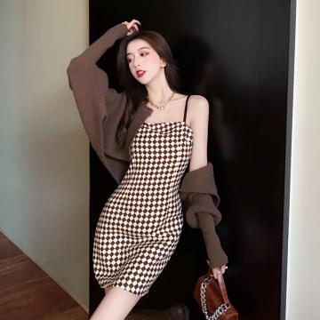 FA42512# 短款针织开衫辣妹格子修身吊带裙套装女秋冬毛衣披肩连衣裙两件套 服裝批發女裝批發服飾貨源