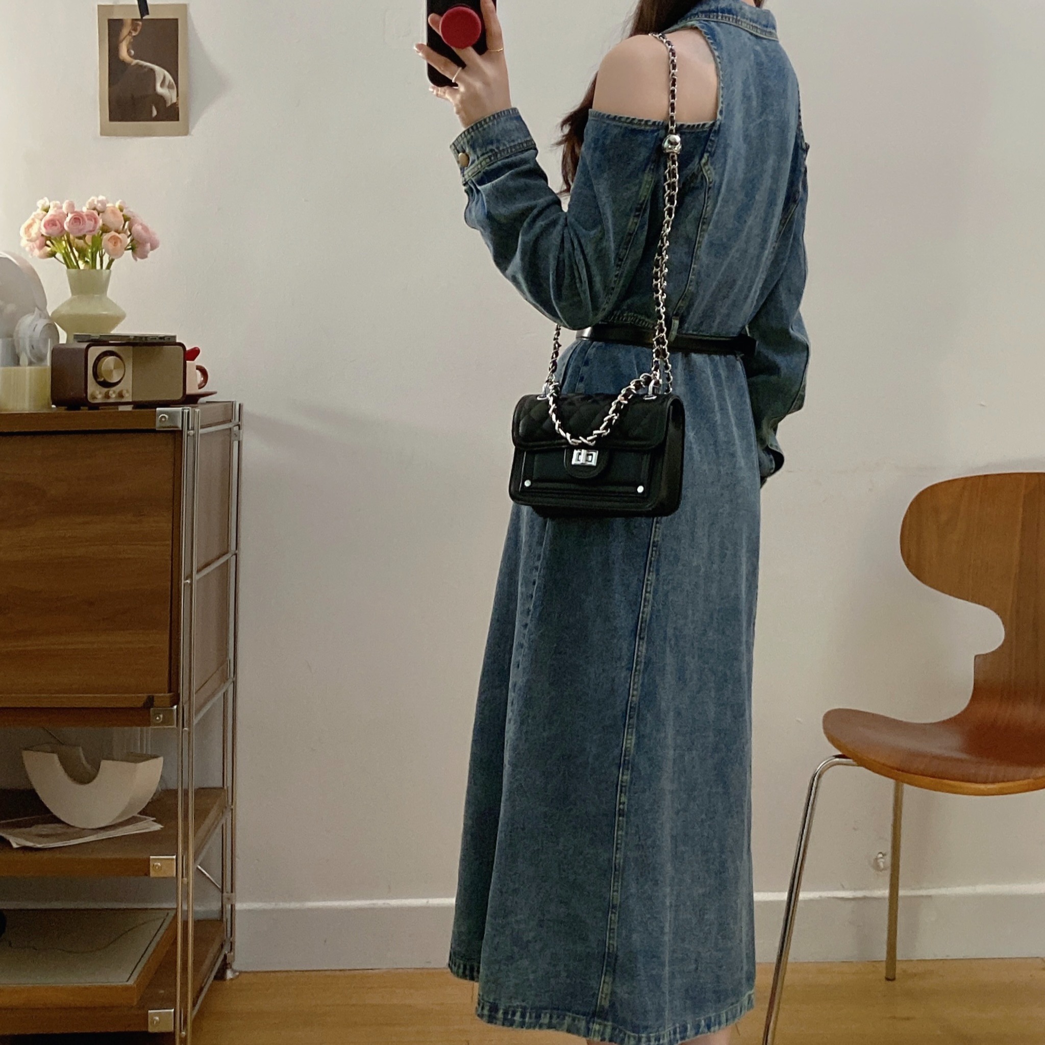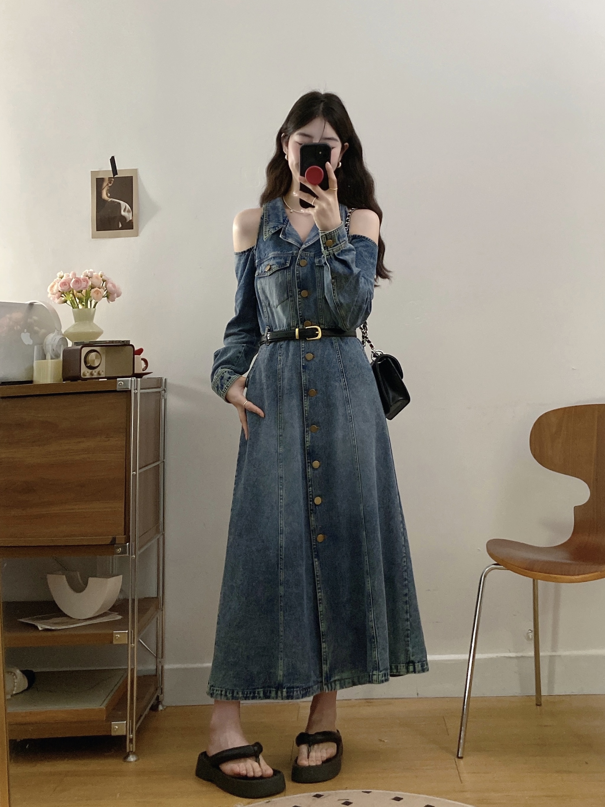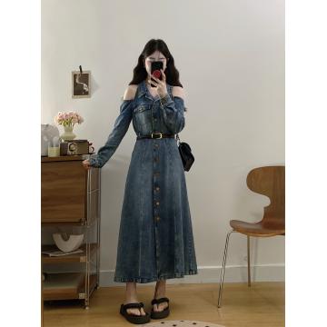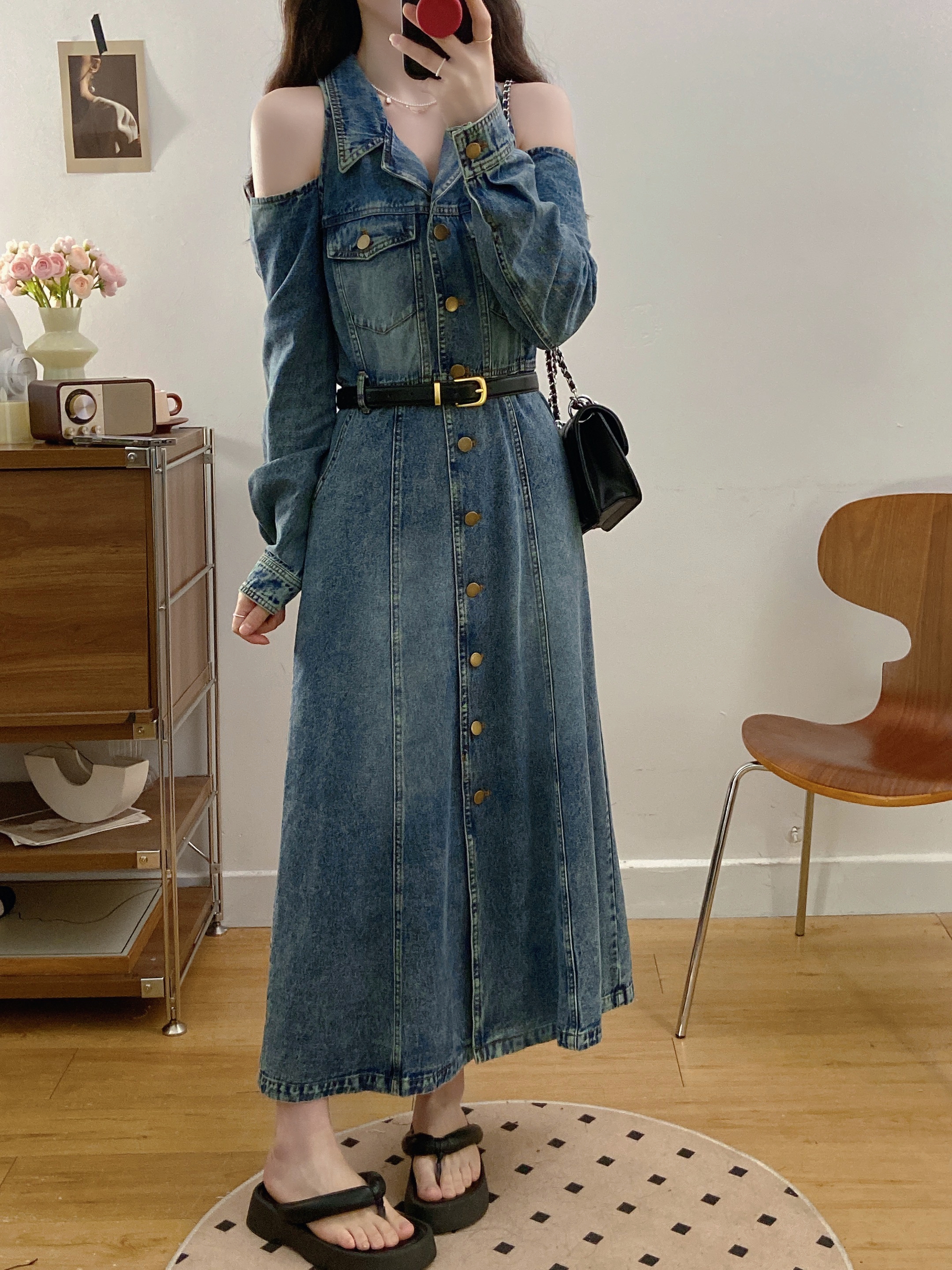 FA42826# 大码港风复古露肩牛仔连衣裙配腰带收腰显瘦翻领长裙 服裝批發女裝批發服飾貨源