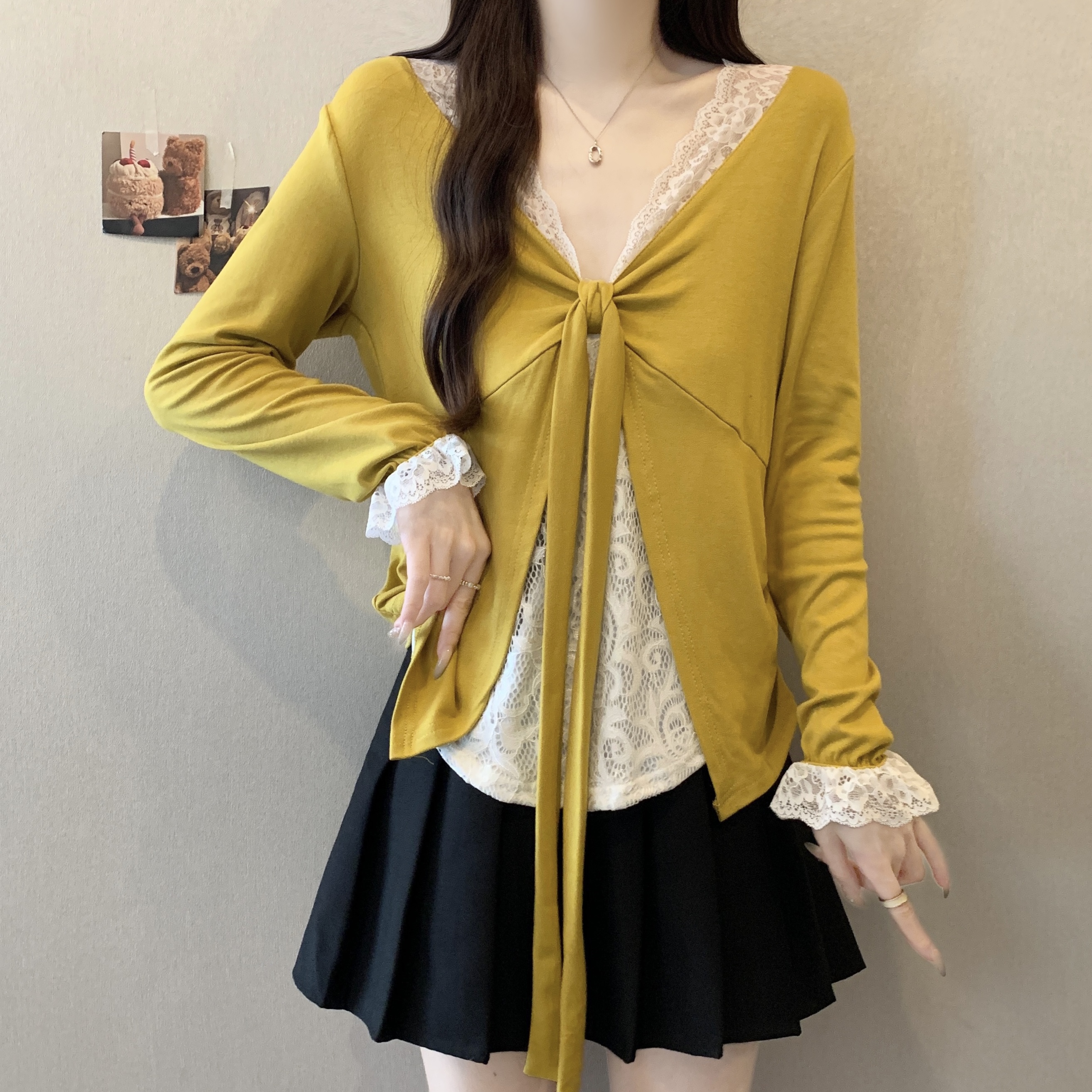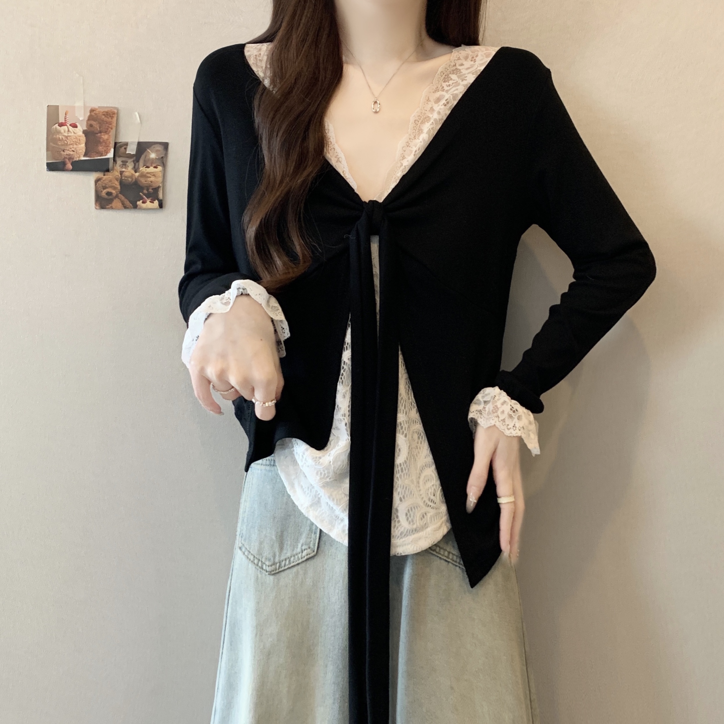 FA43046# 大码纯欲风V领绑带蕾丝拼接长袖秋新款胖mm修身显瘦上衣 服裝批發女裝批發服飾貨源