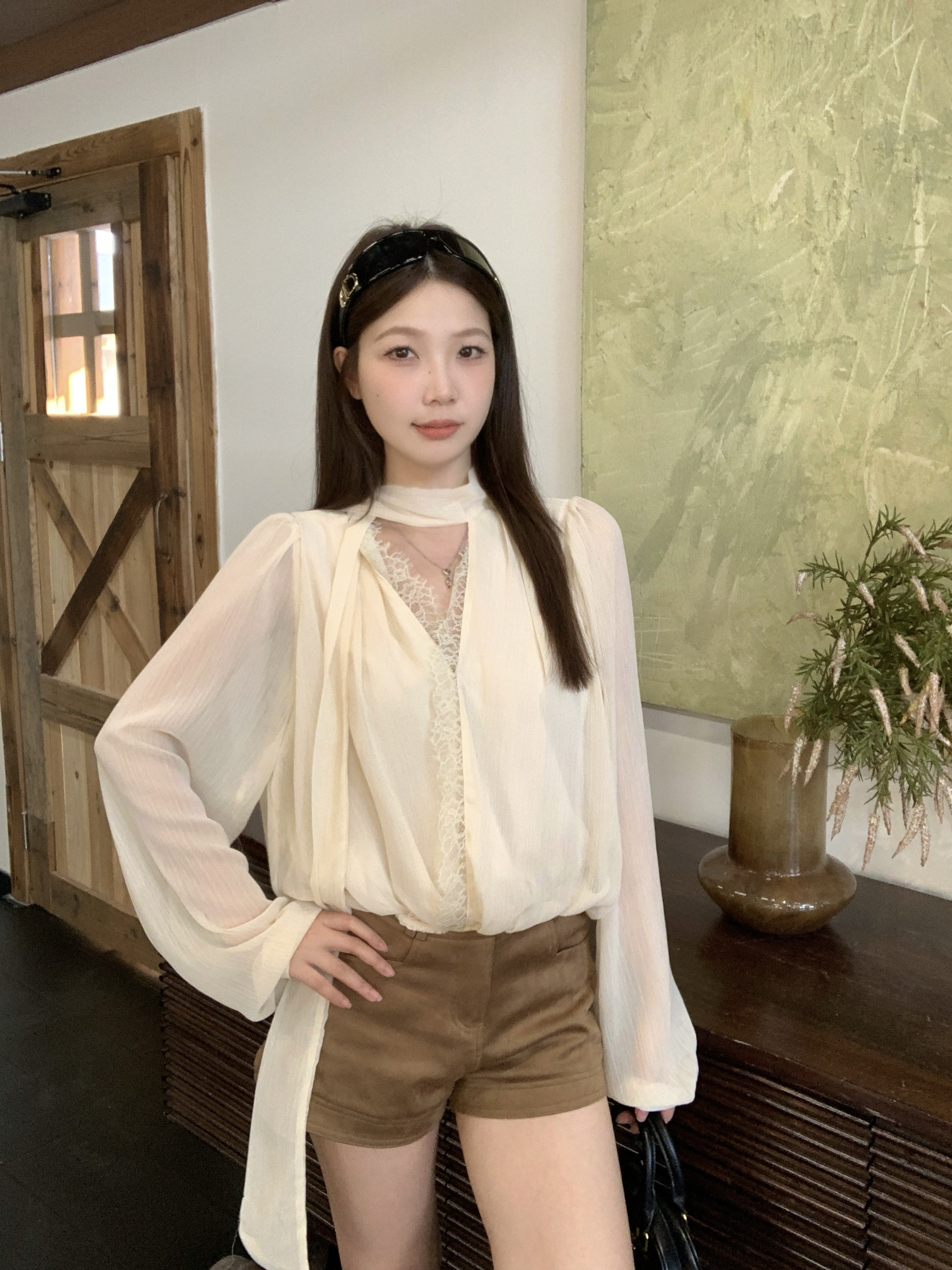 FA43211# 大码蕾丝拼接设计飘带V领上衣女秋贵气感轻奢名媛宽松长袖衬衫 服裝批發女裝批發服飾貨源