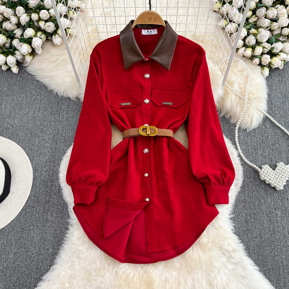 FA43223# 港味复古气质灯芯绒pu皮拼接泡泡袖衬衫裙POLO领收腰a字连衣裙女 服裝批發女裝批發服飾貨源