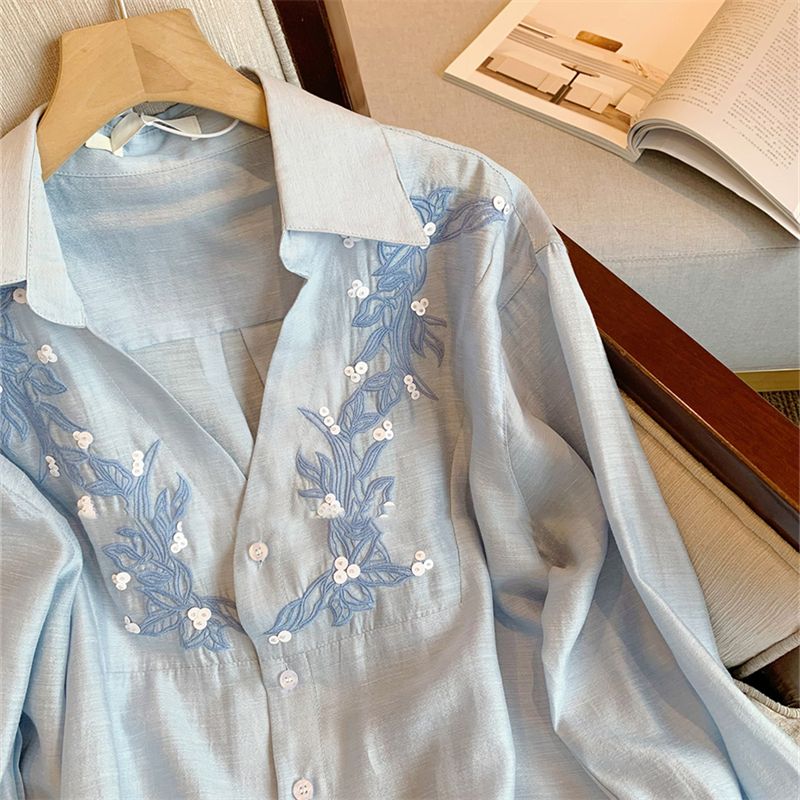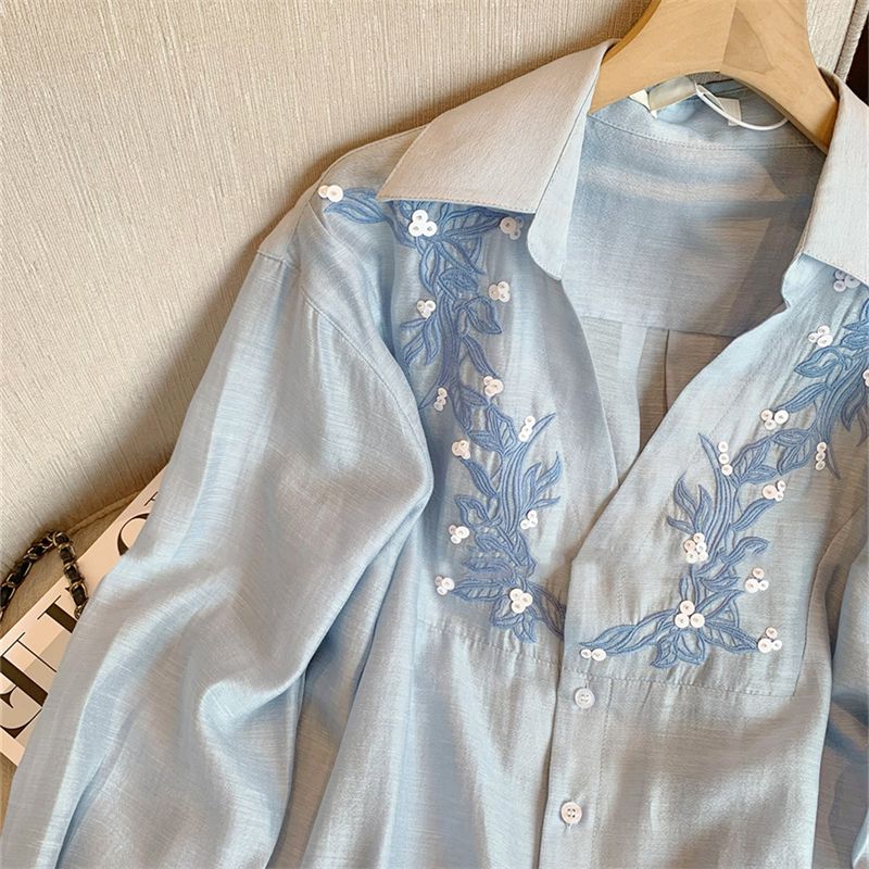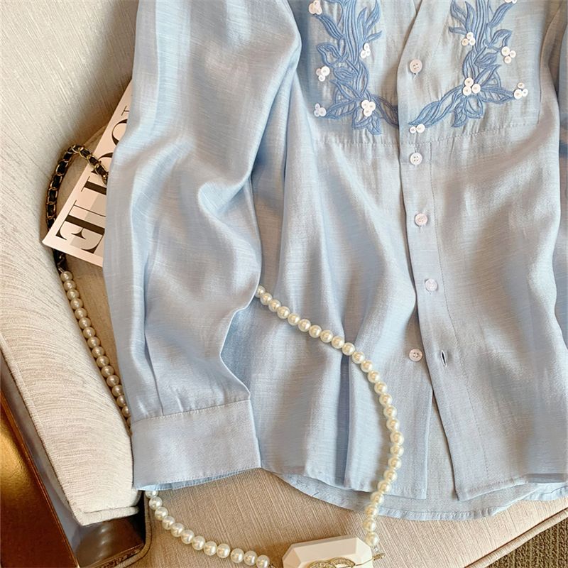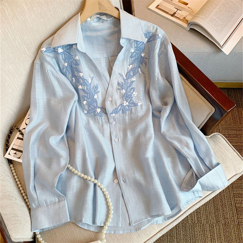 FA43329# 设计感重工刺绣翻领长袖衬衫女春秋欧货宽松衬衣开衫潮 服裝批發女裝批發服飾貨源