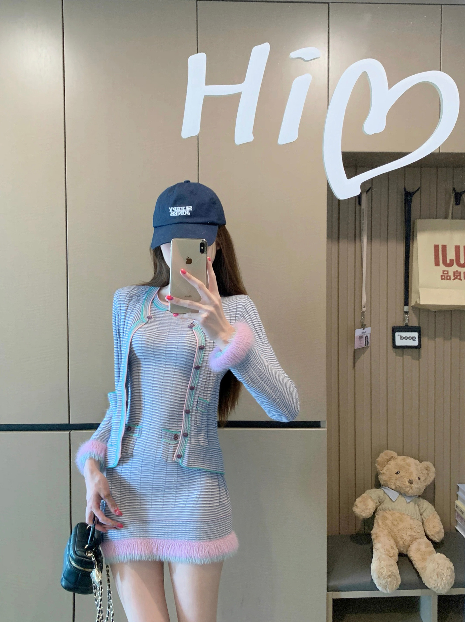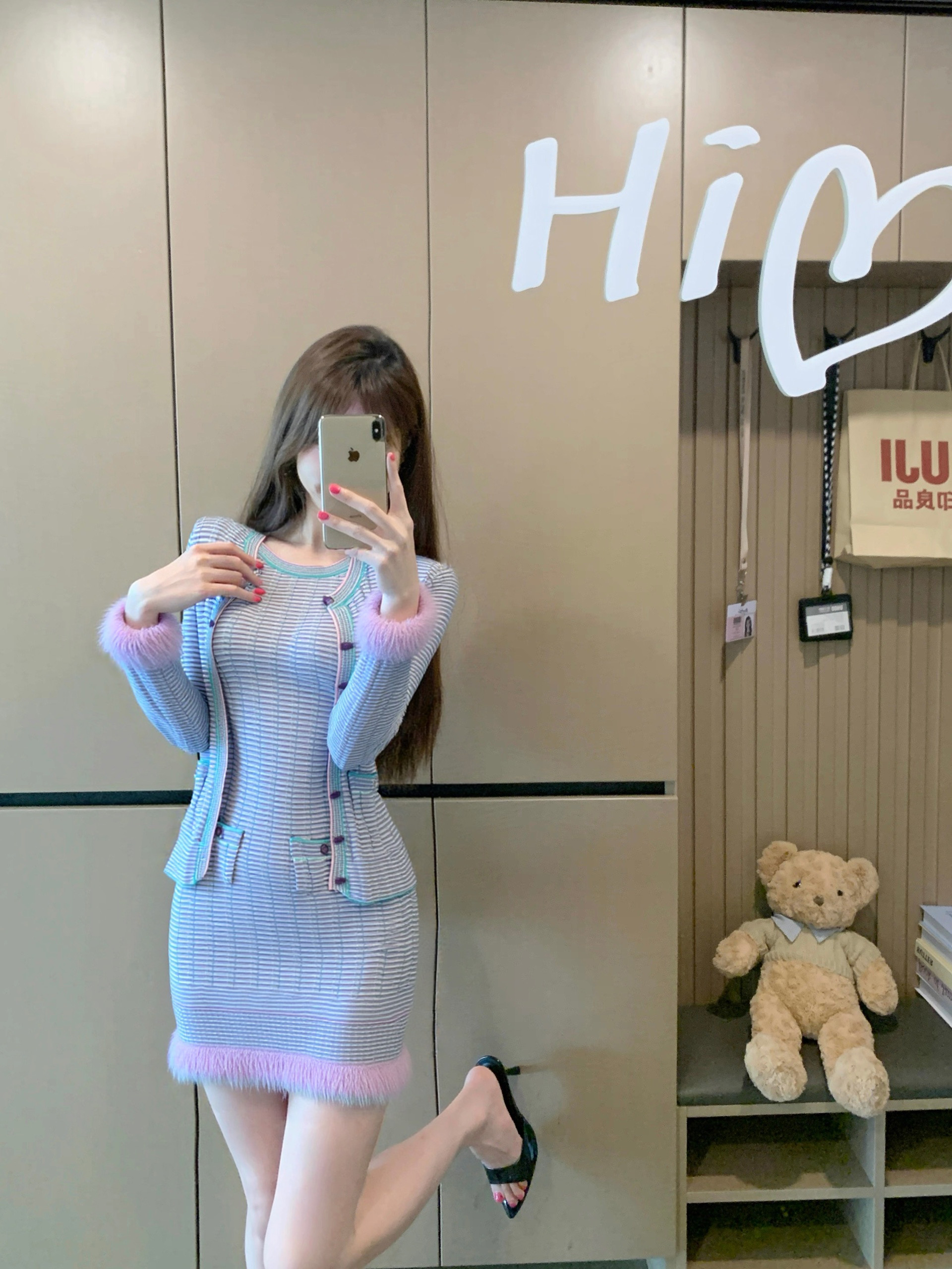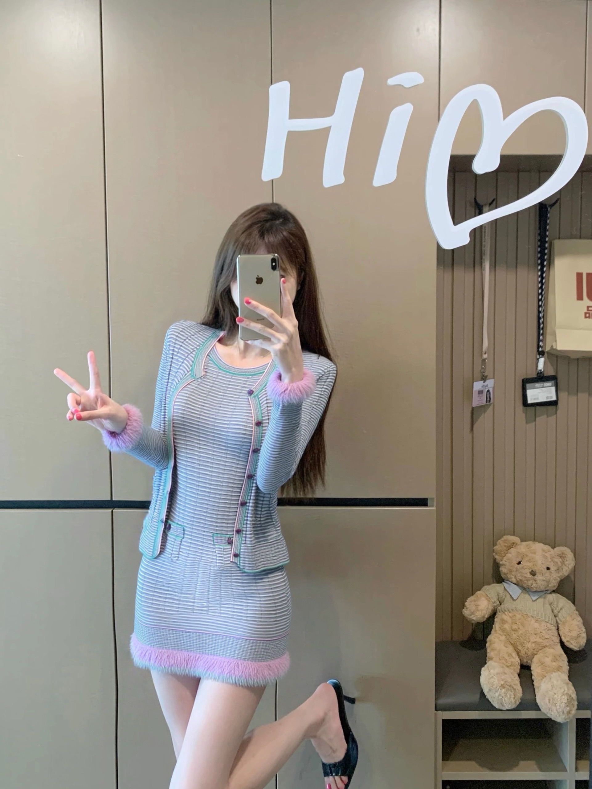 FA43378# 蓝花楹温柔毛感拼接针织连衣裙+开衫外套女秋 服裝批發女裝批發服飾貨源