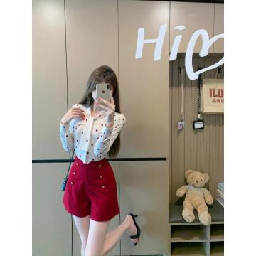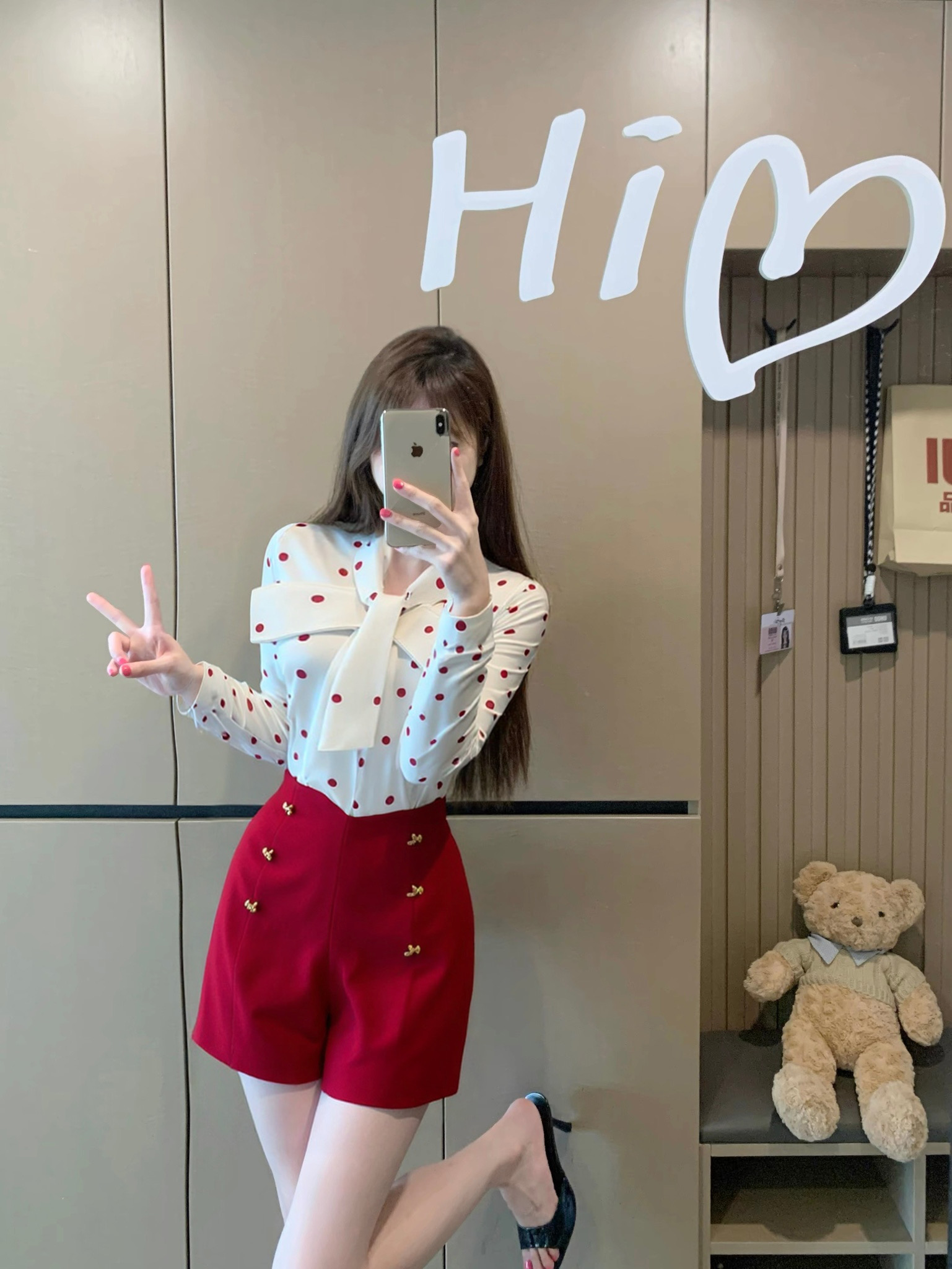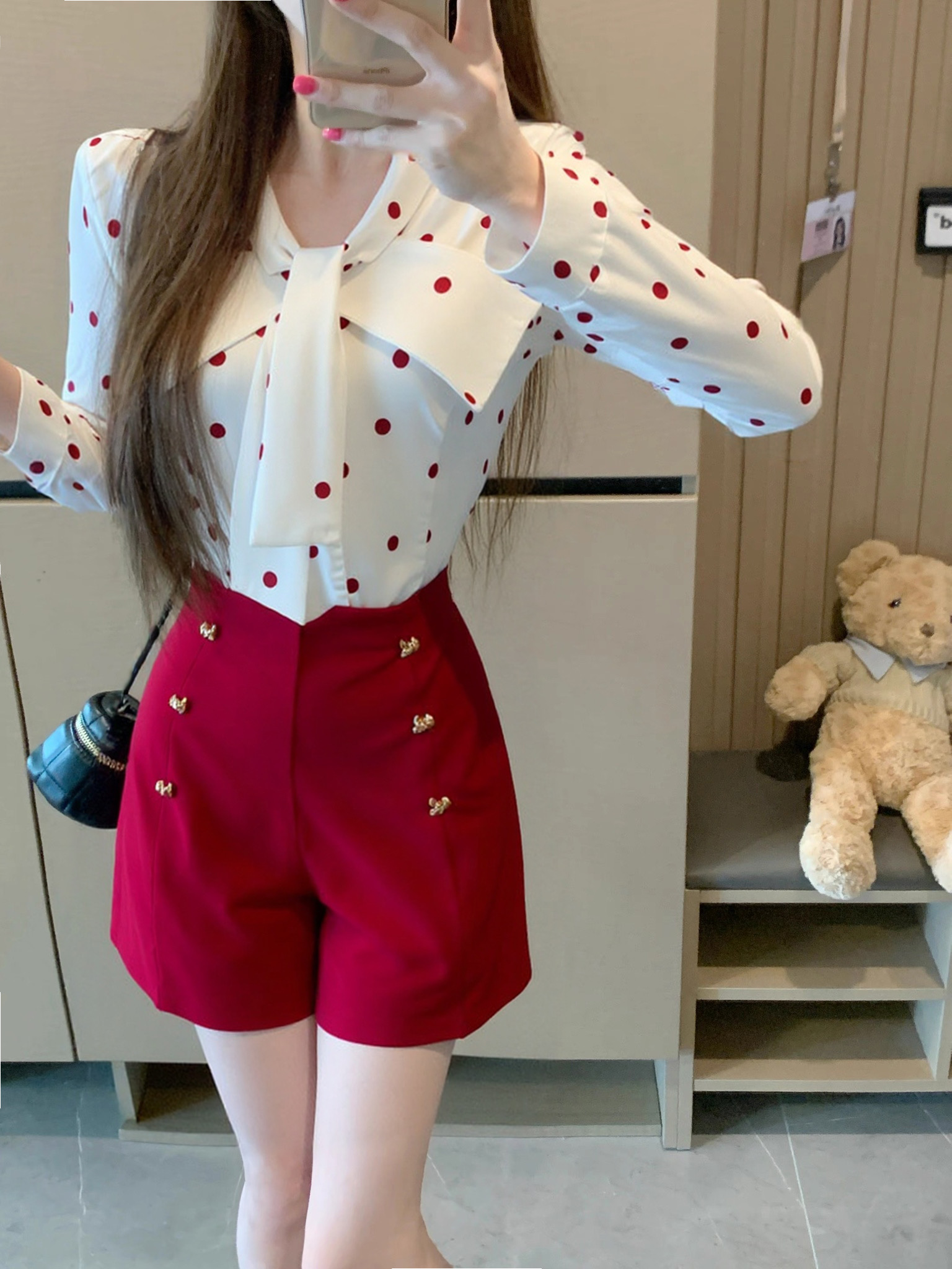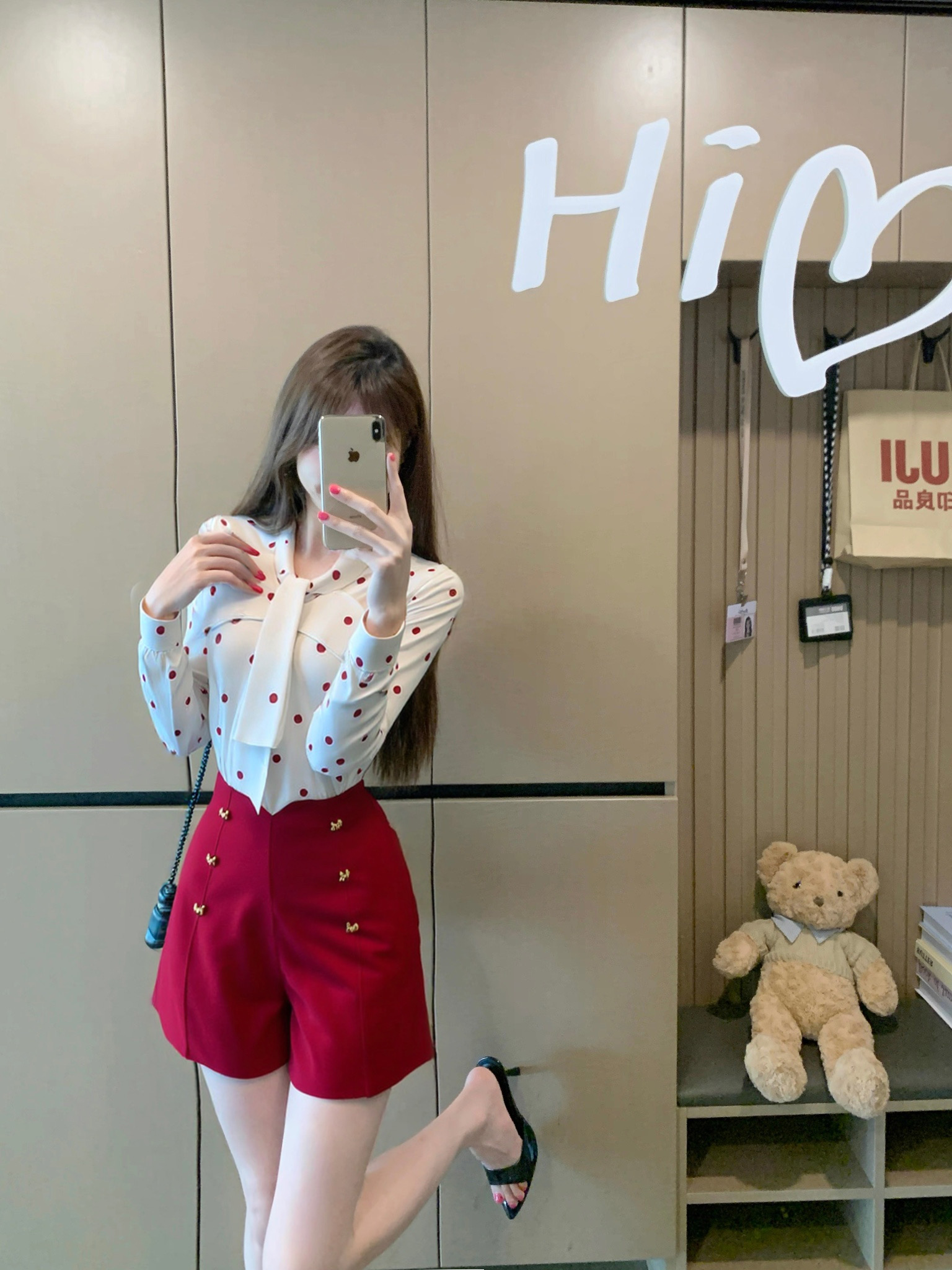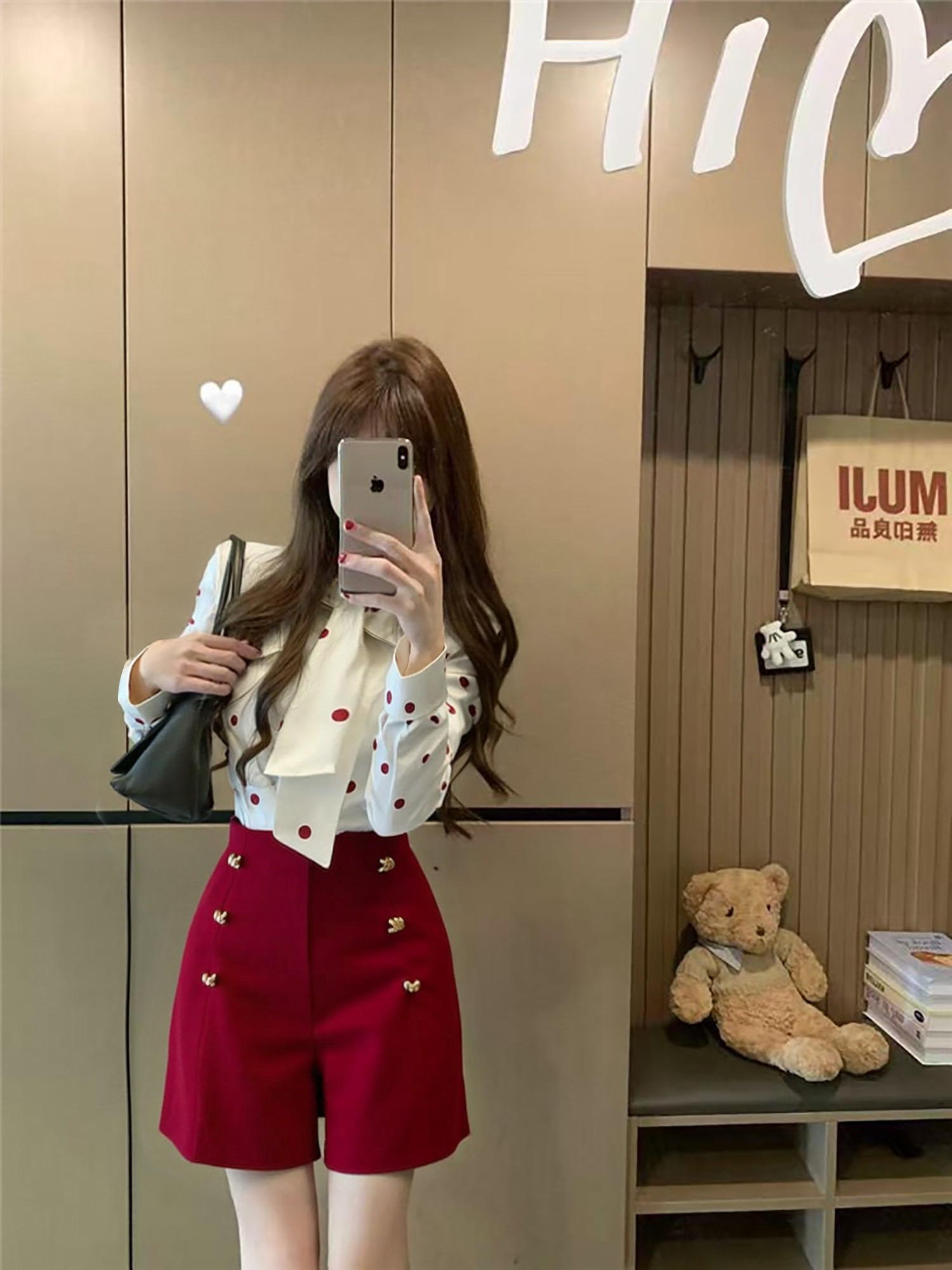 FA43386# 复古港风红波点飘带衬衫+短裤 服裝批發女裝批發服飾貨源