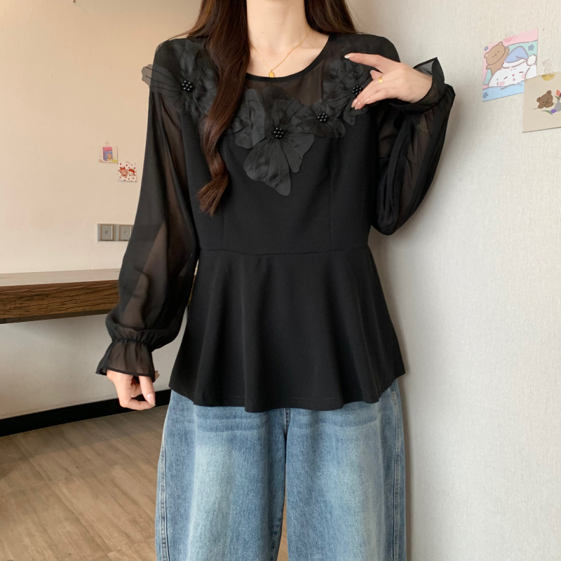 FA43395# 大码女装胖MM秋款立体花拼贴显瘦收腰遮肚洋气小众设计感上衣 服裝批發女裝批發服飾貨源