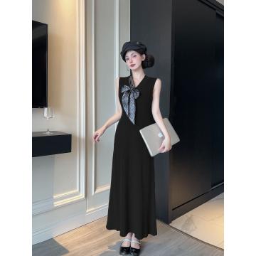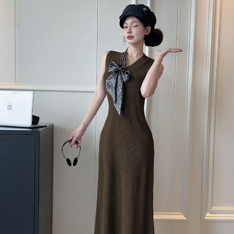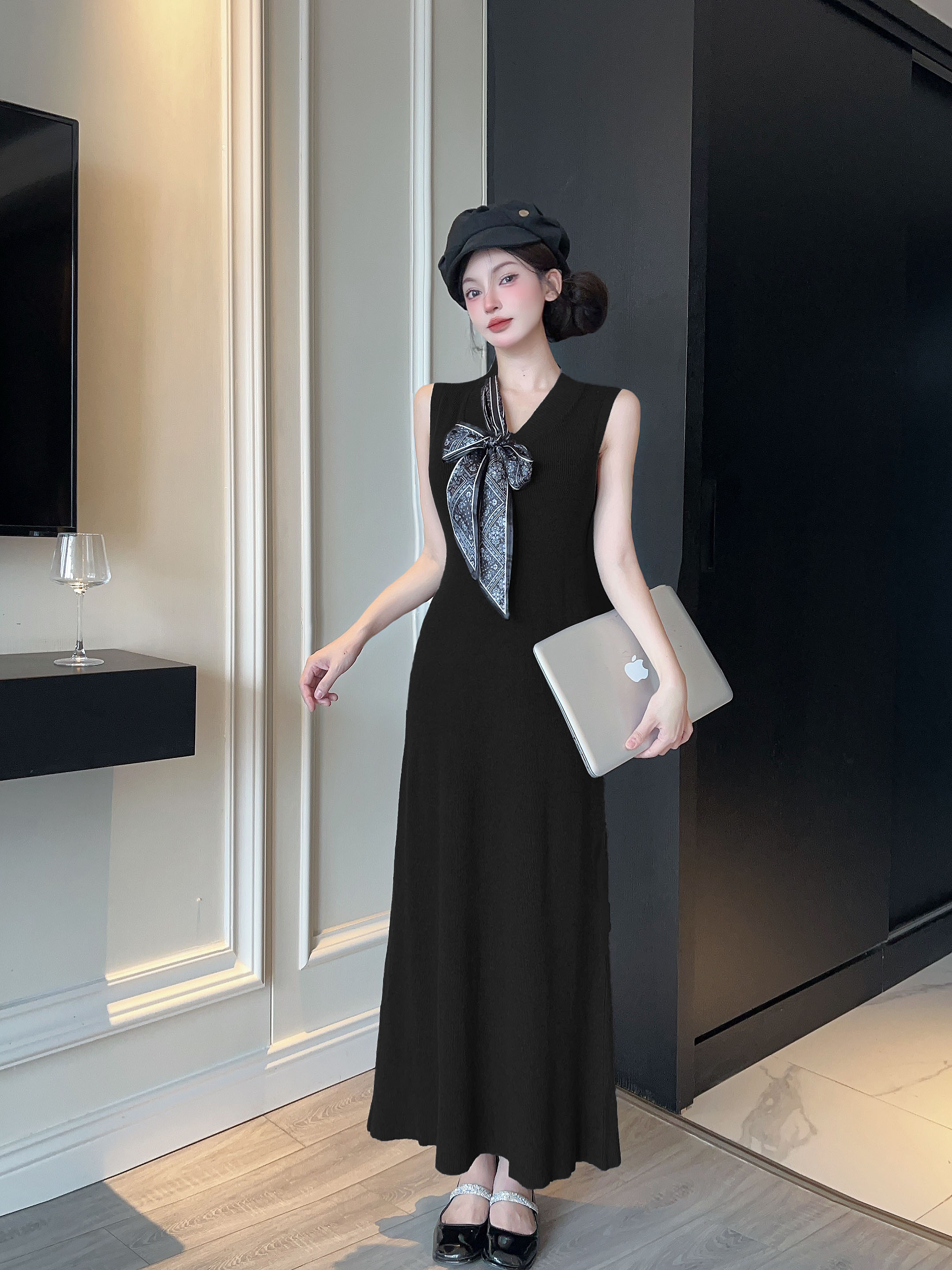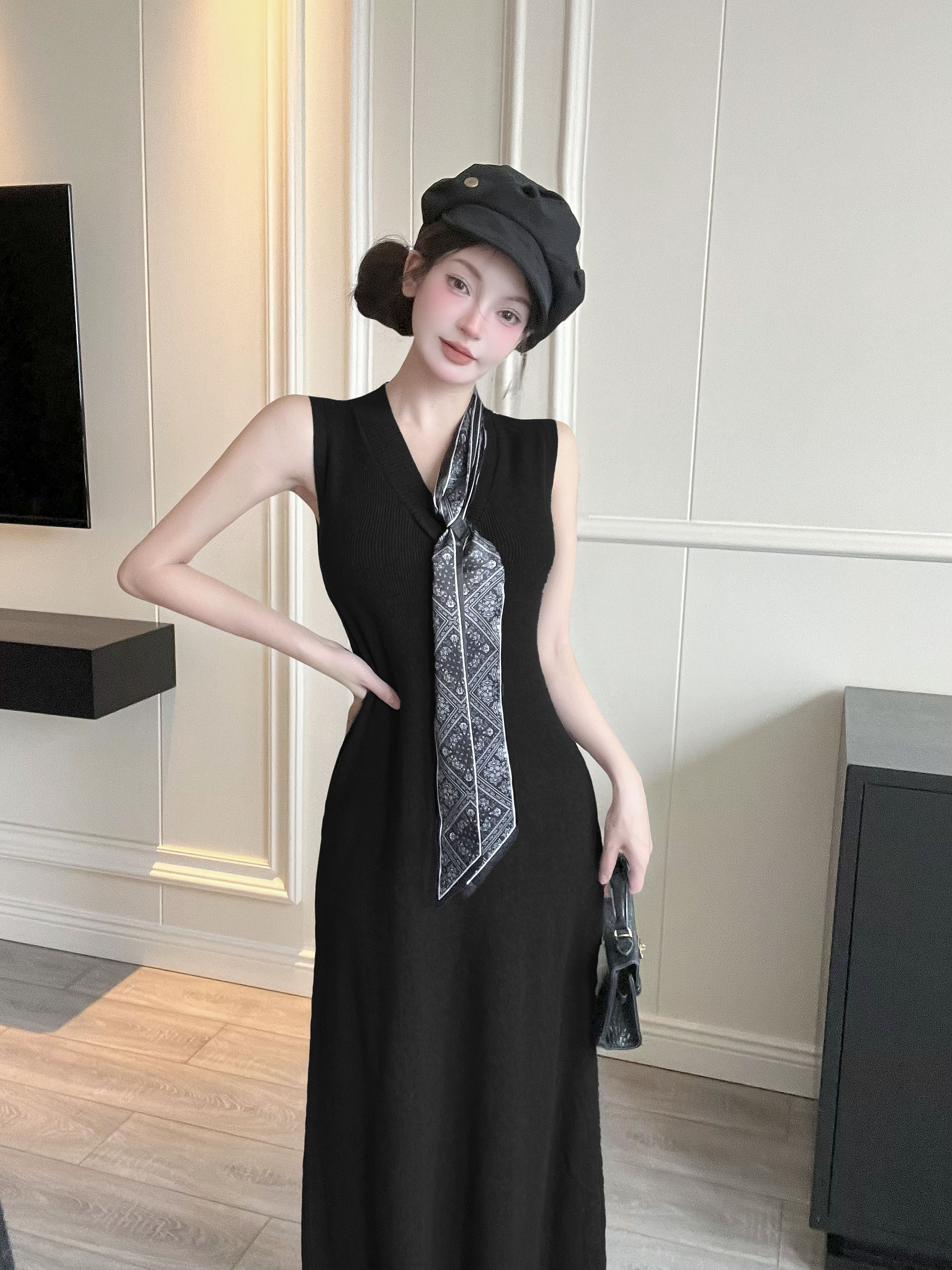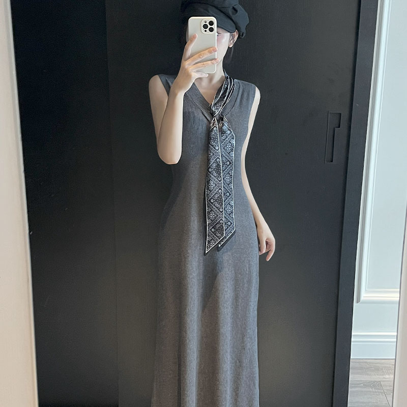 FA43457# 今年流行V领配丝巾针织背心连衣裙秋冬新款宽松外穿内搭打底 服裝批發女裝批發服飾貨源