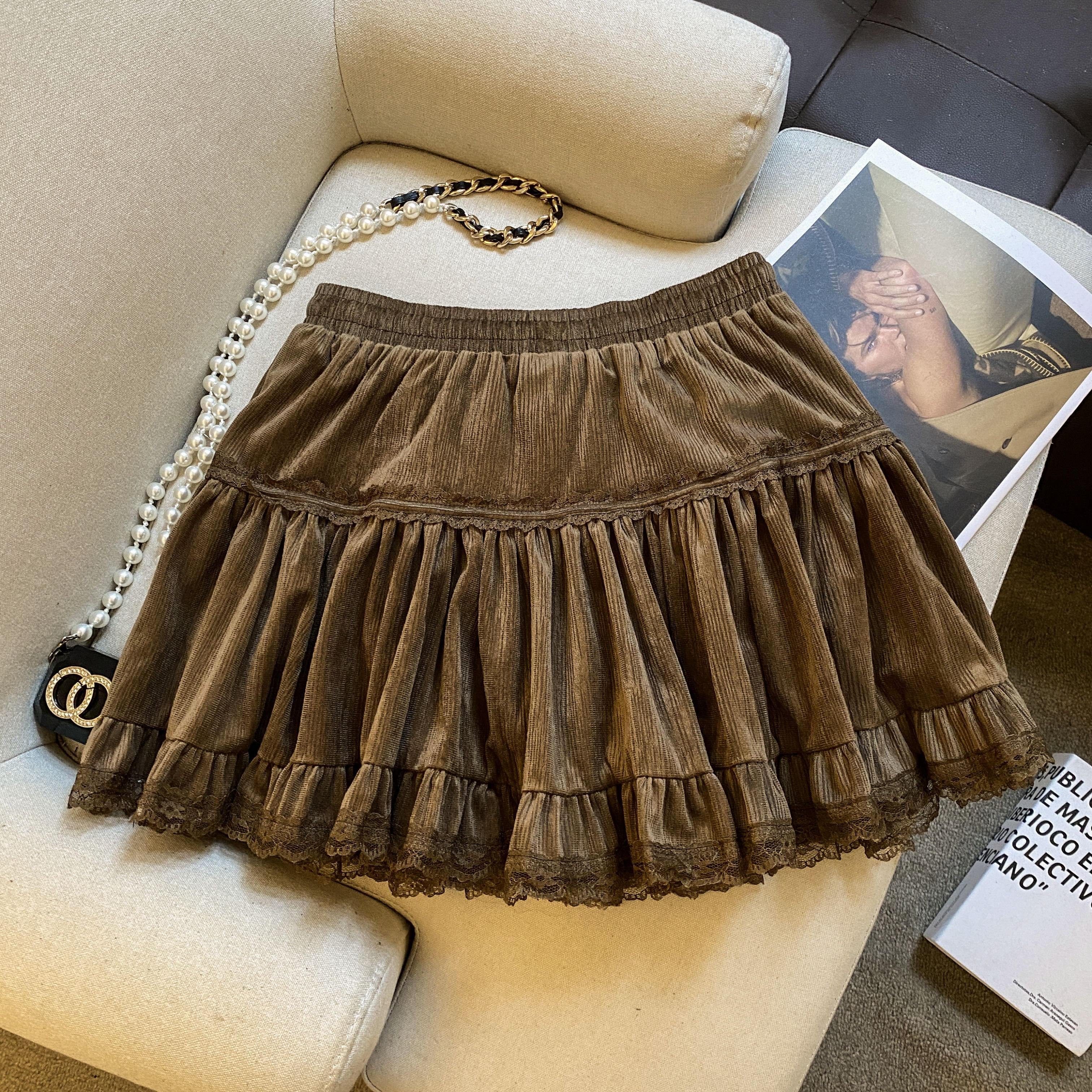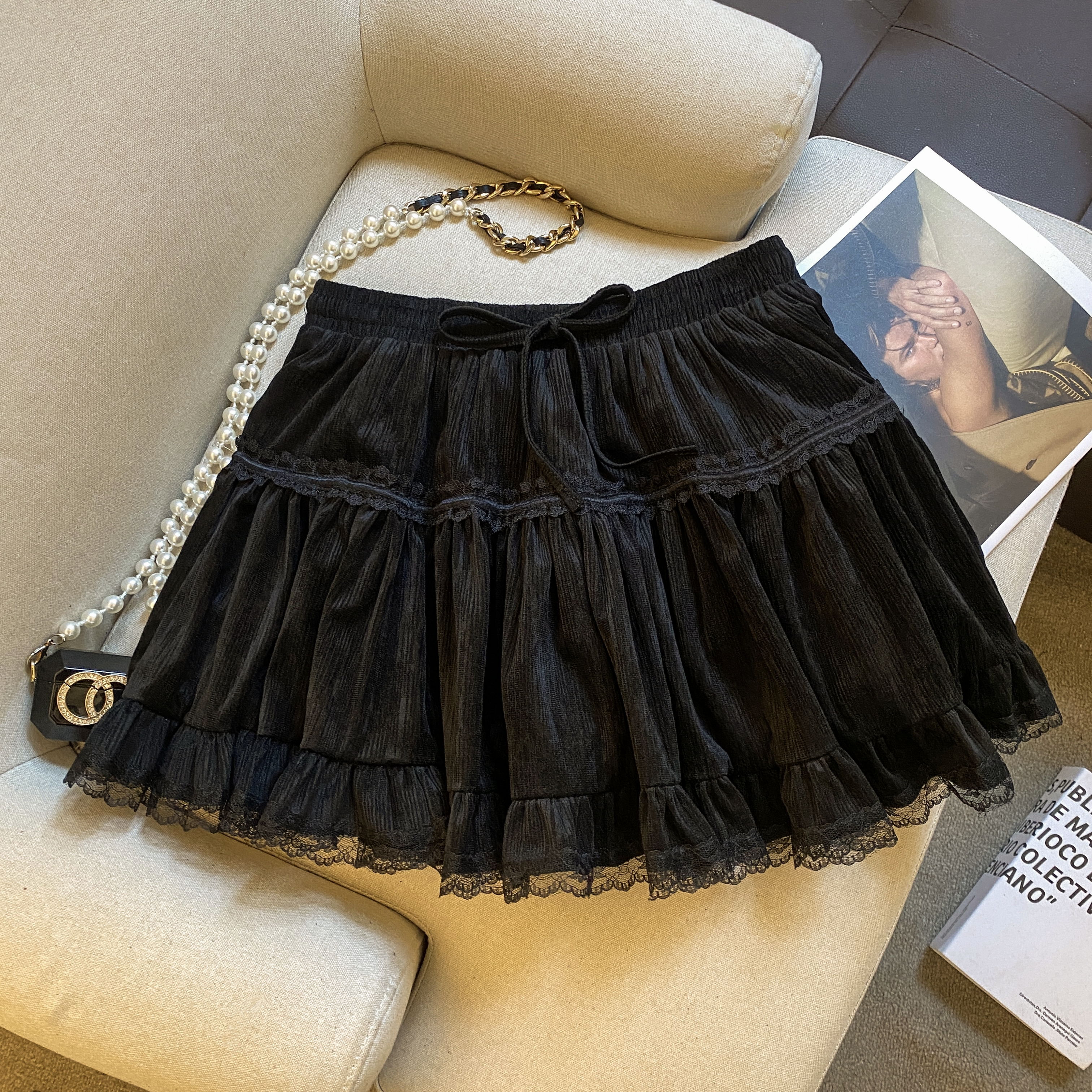 FA43551# 韩系复古百搭高腰显廋蕾丝荷叶边半身裙丝绒蓬蓬短裙 服裝批發女裝批發服飾貨源
