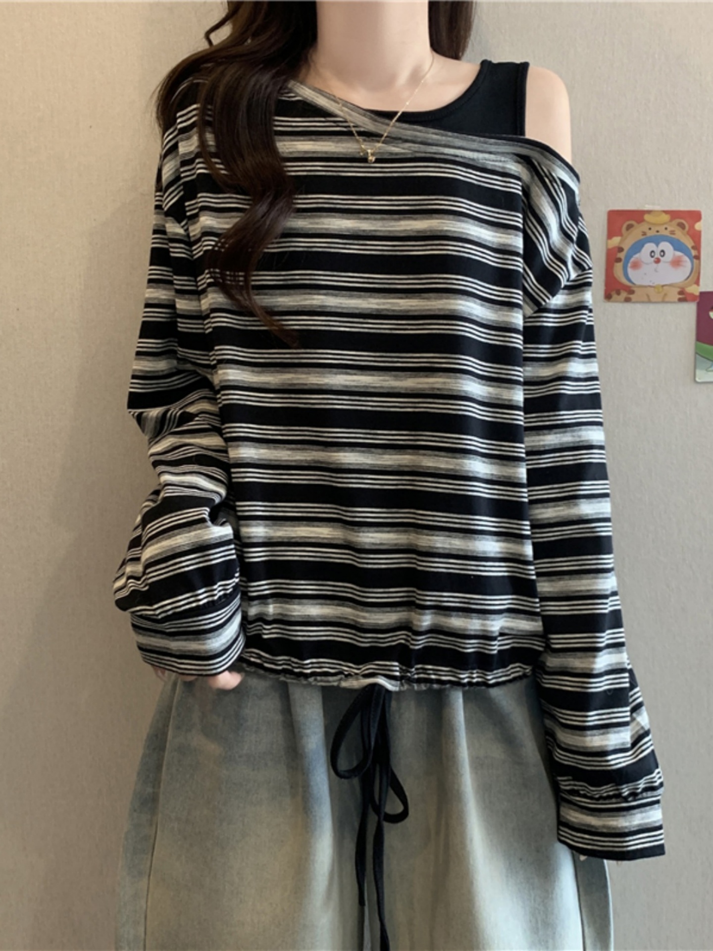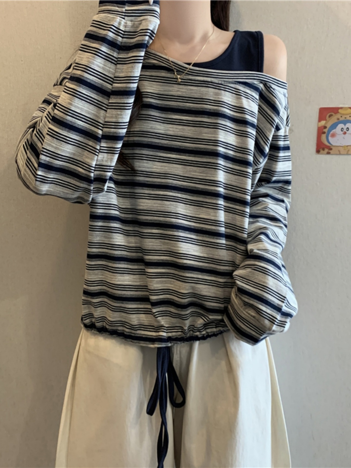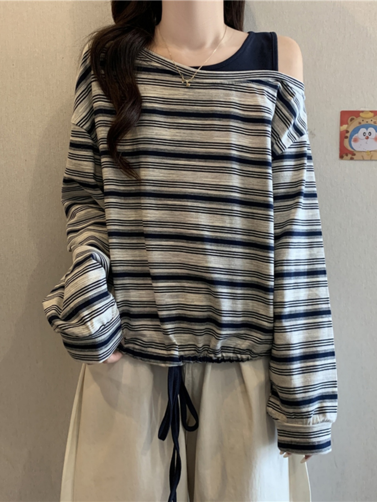 FA44127# 原版色织条纹秋季设计感斜领露肩抽绳条纹卫衣宽松长袖T恤上衣女 服裝批發女裝批發服飾貨源