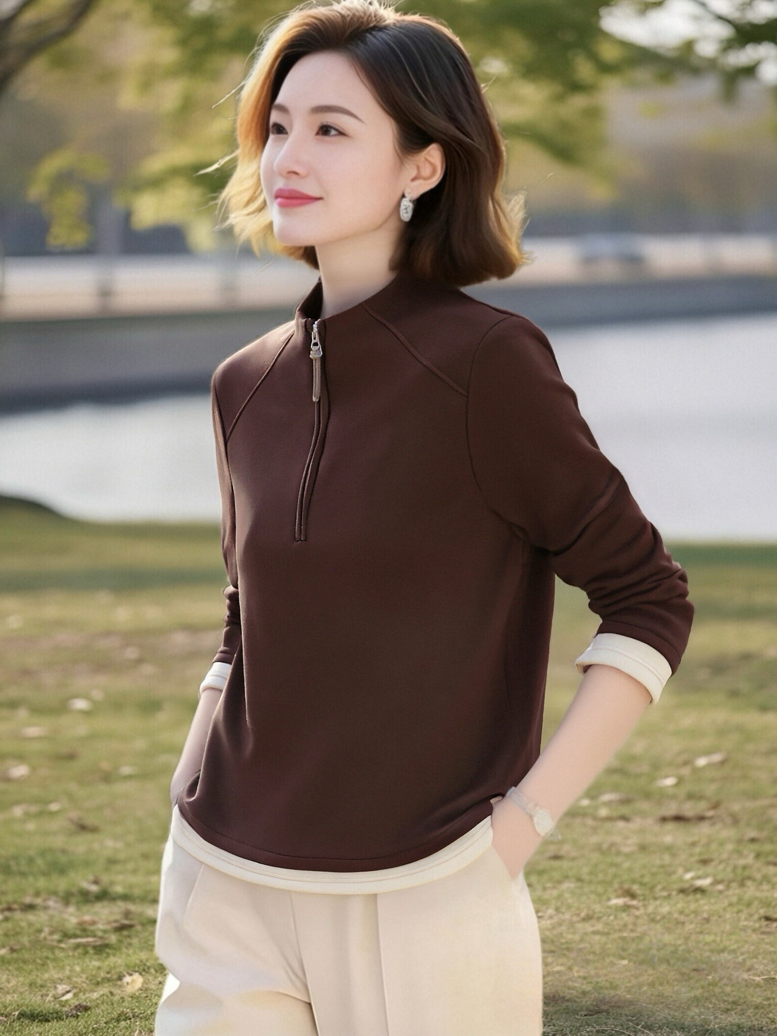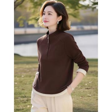 FA44155# 春秋季新款半拉链长袖T恤女德绒休闲运动宽松打底衫立领上衣 服裝批發女裝批發服飾貨源