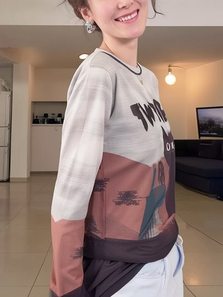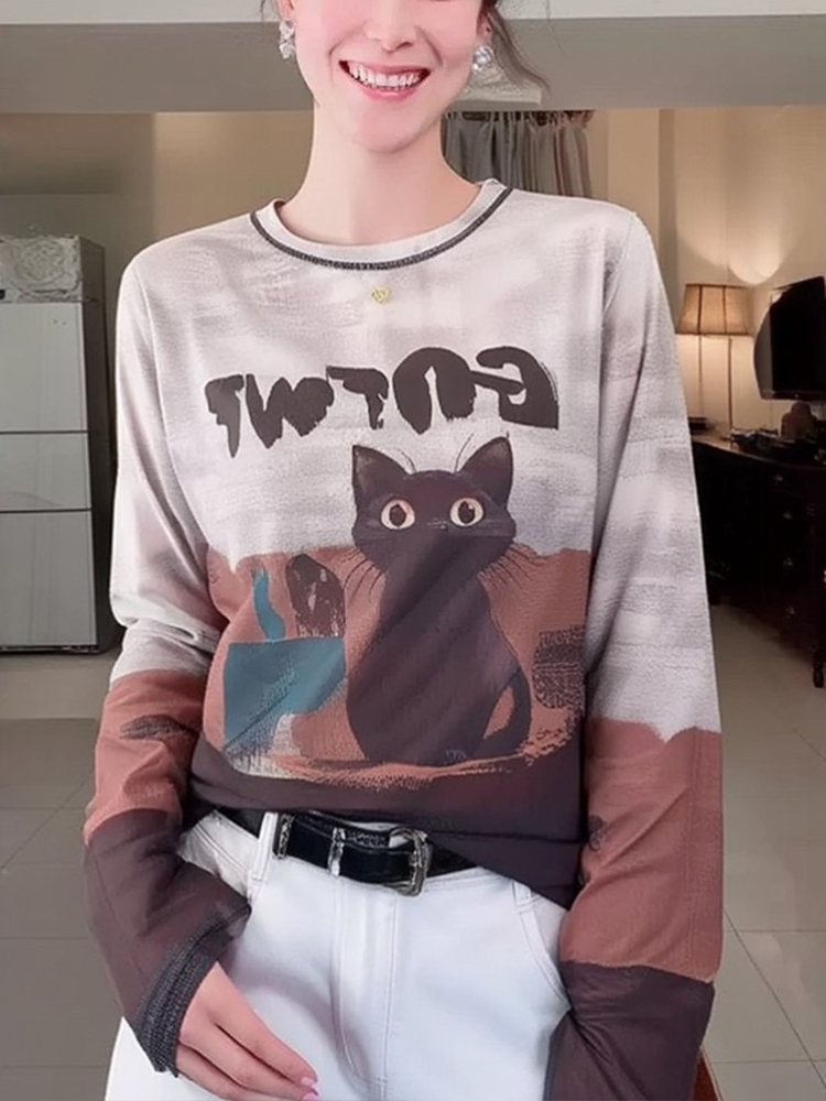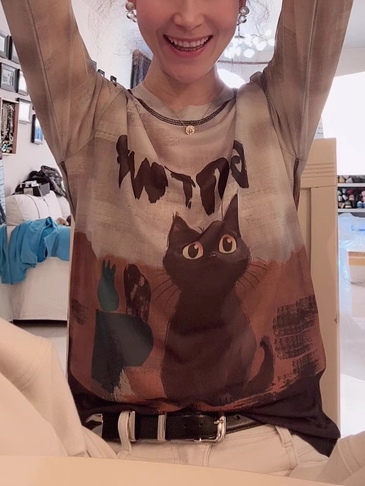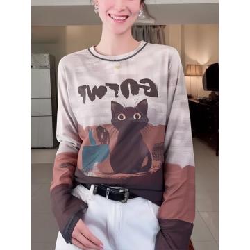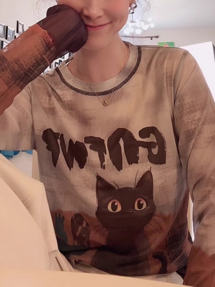 FA44167# 美拉德色系猫咪印花网纱长袖秋季新款上衣高级感轻奢减龄洋气 服裝批發女裝批發服飾貨源