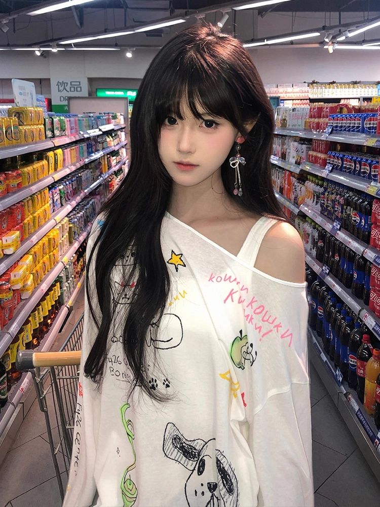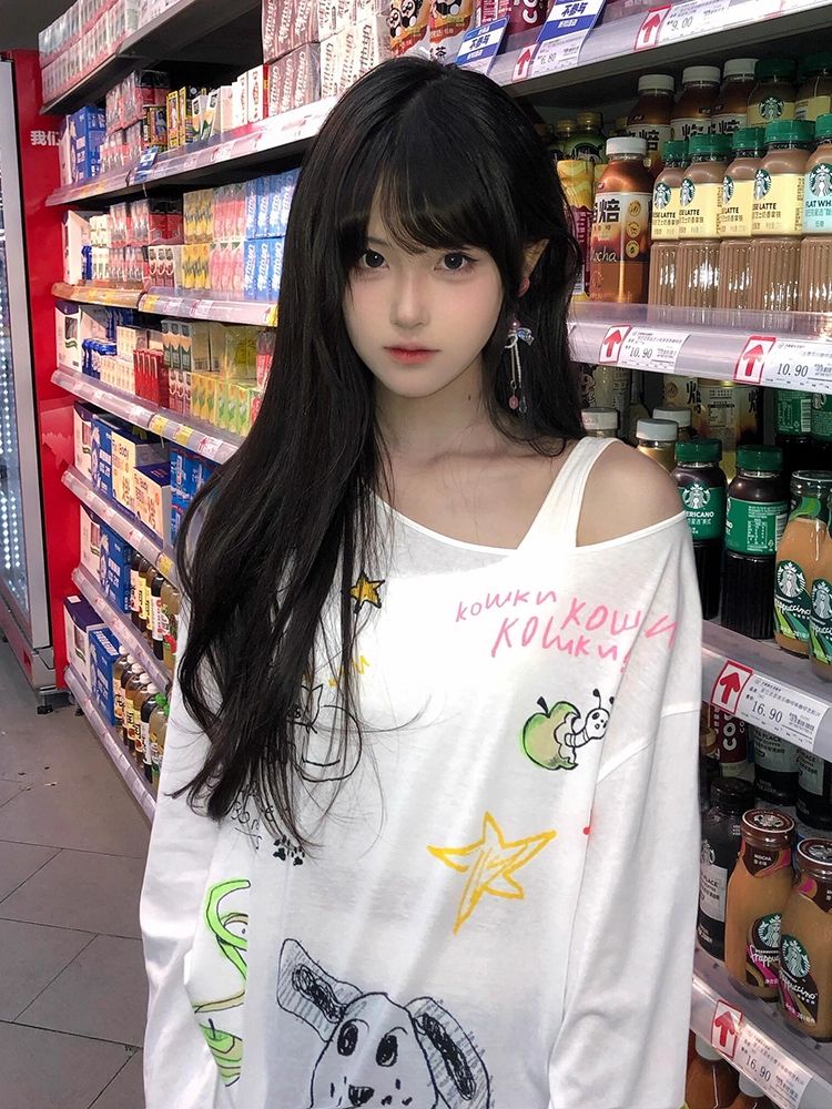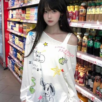 FA44178# 涂鸦印花斜领长袖t恤女夏季薄款防晒罩衫独特漂亮斜肩上衣ins 服裝批發女裝批發服飾貨源