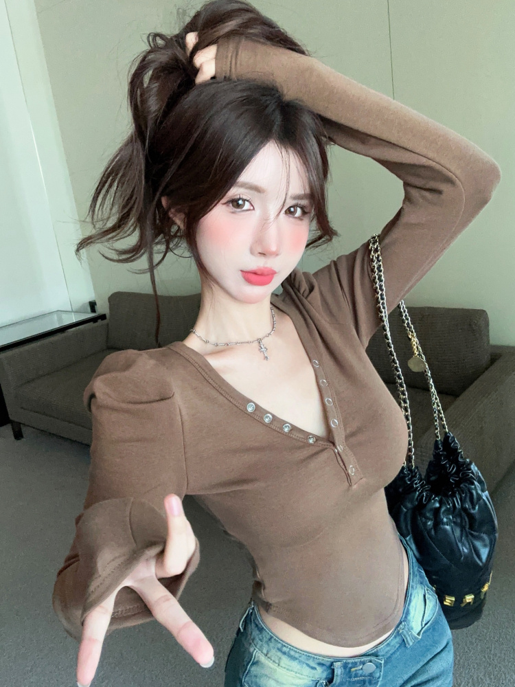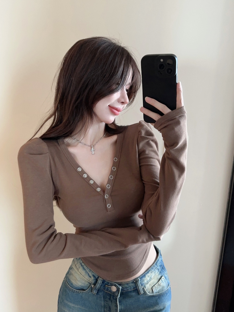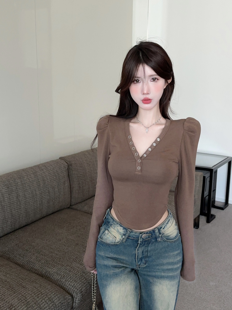 FA44252# 秋冬薄绒辣妹V领泡泡袖修身显瘦打底衫 服裝批發女裝批發服飾貨源