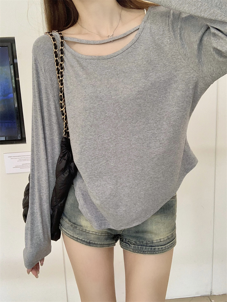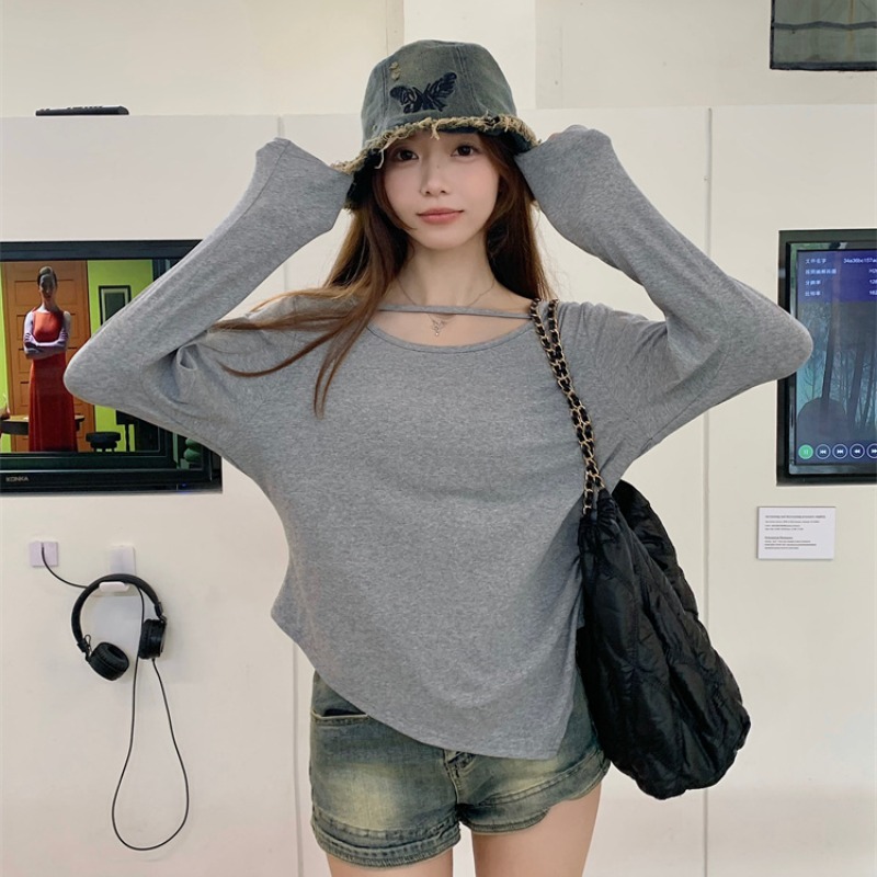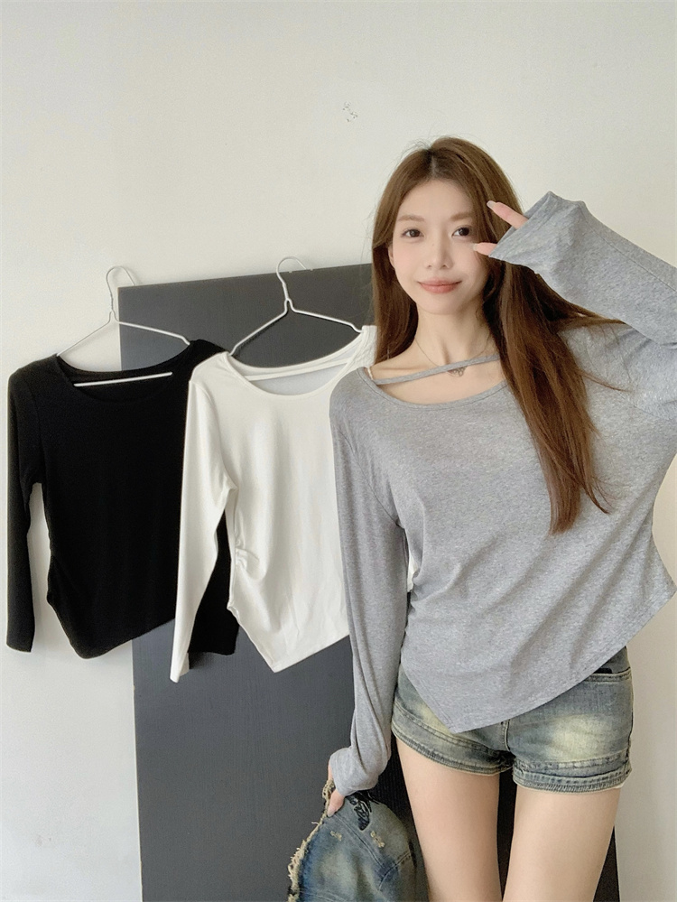 FA44340# 大码长袖T恤女收腰显瘦白色纯欲不规则上衣 服裝批發女裝批發服飾貨源