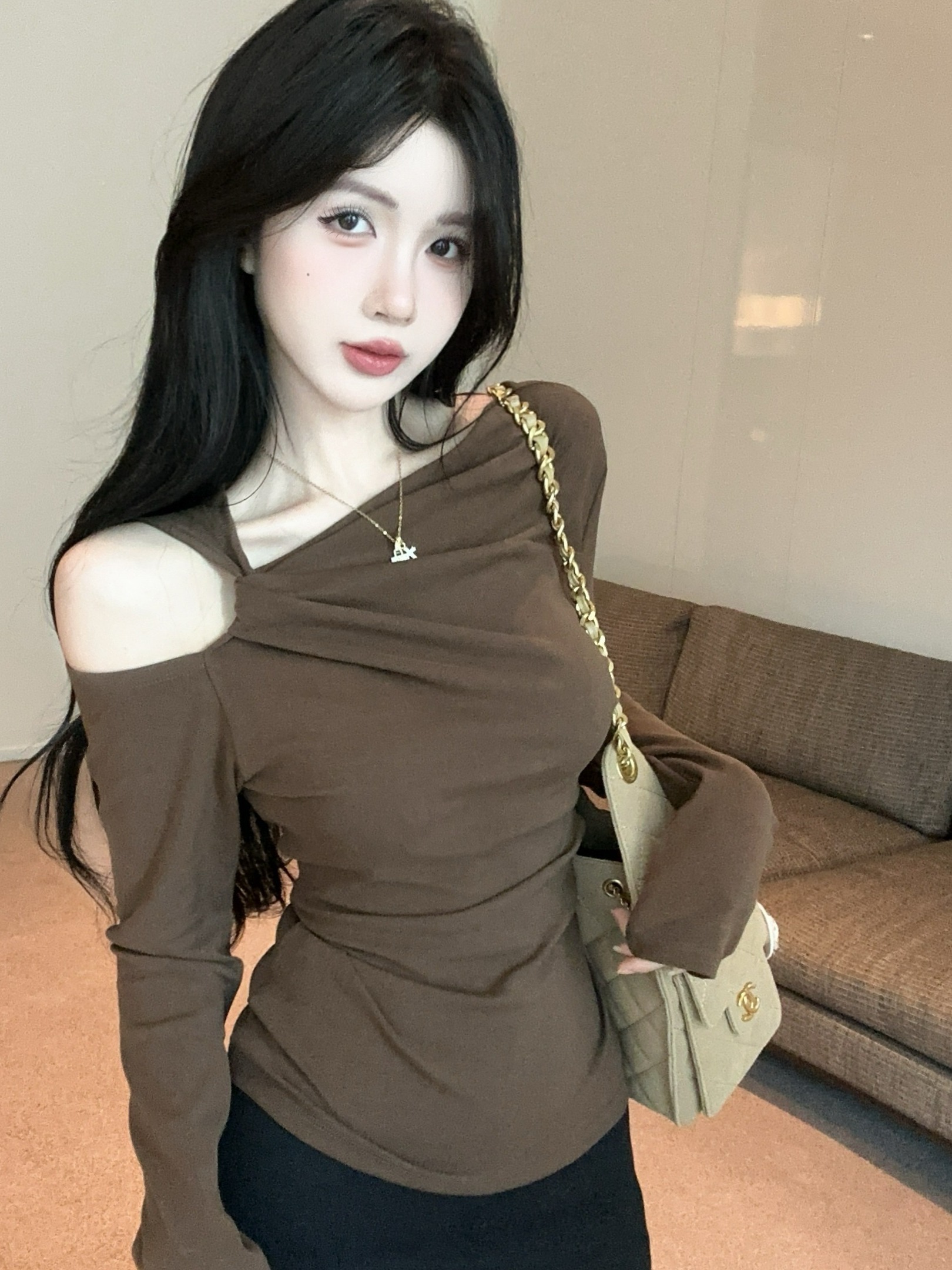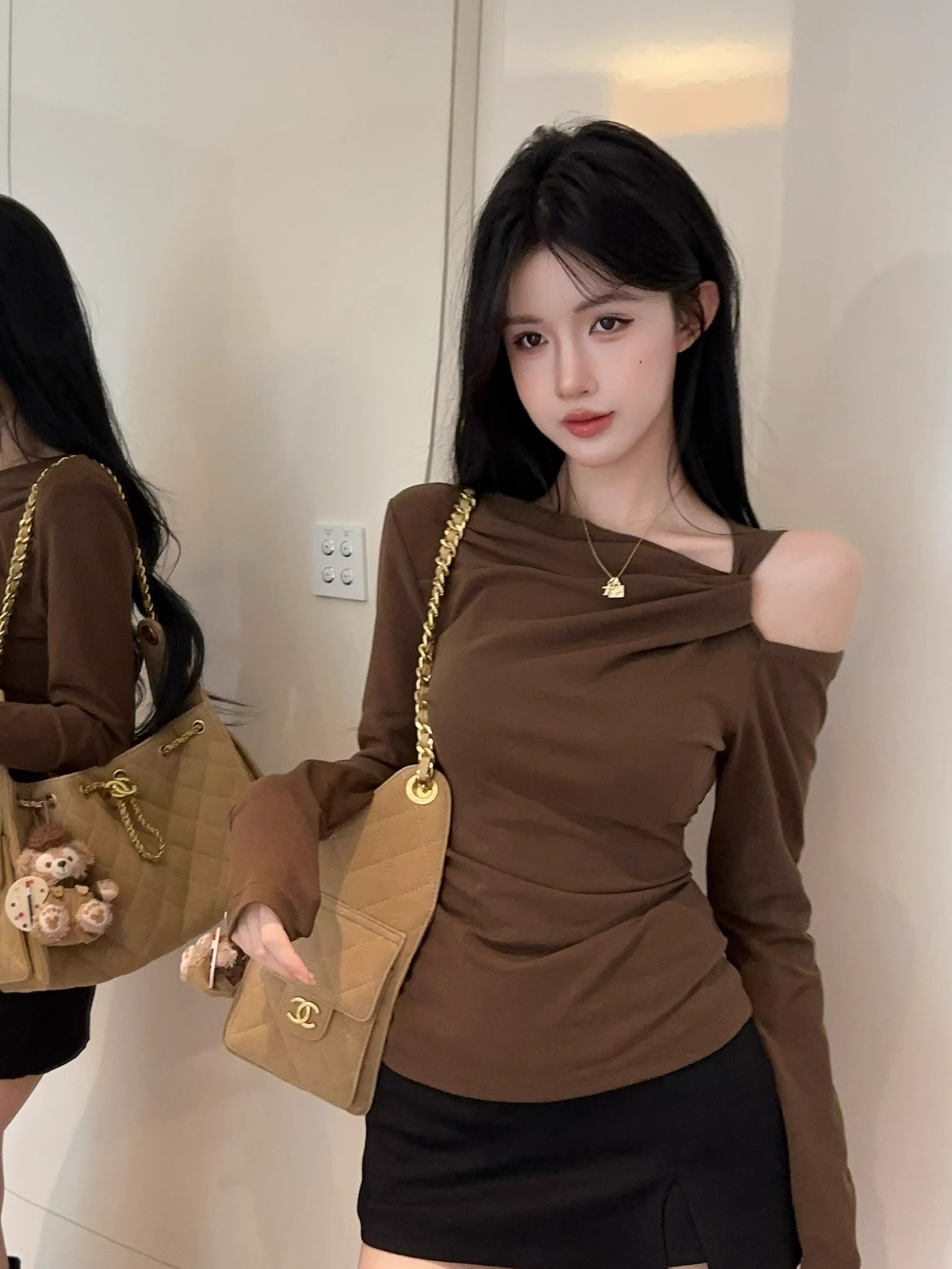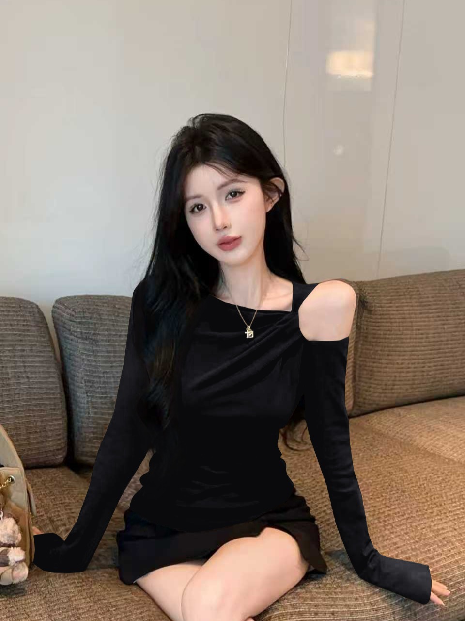 FA44353# 莫代尔人棉港味复古小众扭结露肩长袖T恤女秋季褶皱上衣 服裝批發女裝批發服飾貨源