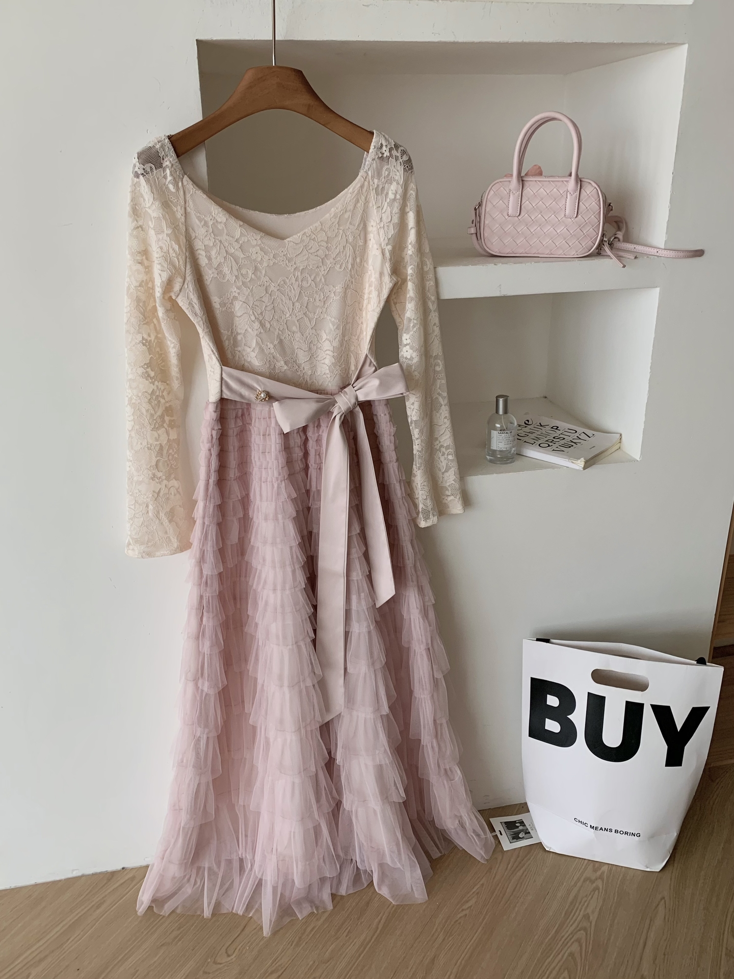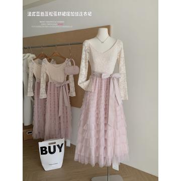 FA47937# 猫年粉荔漫舞复古法式蕾丝蓬松蛋糕裙摆连衣裙加绒 服裝批發女裝批發服飾貨源