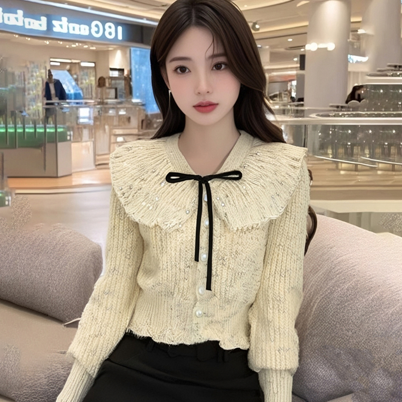 FA48361# 法式气质娃娃领毛衣女装珍珠排扣蝴蝶结气质收腰短款针织 服裝批發女裝批發服飾貨源