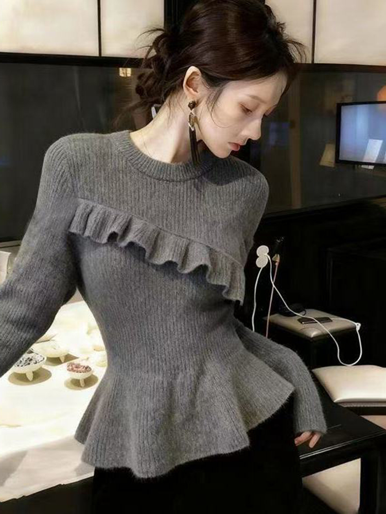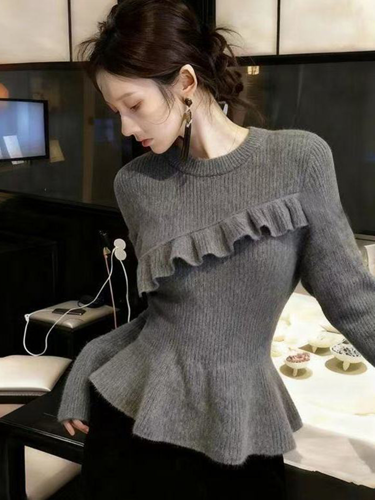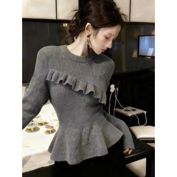 FA48532# 灰色半高领荷叶边针织衫女秋季新款设计小众修身显瘦长袖上衣 服裝批發女裝批發服飾貨源
