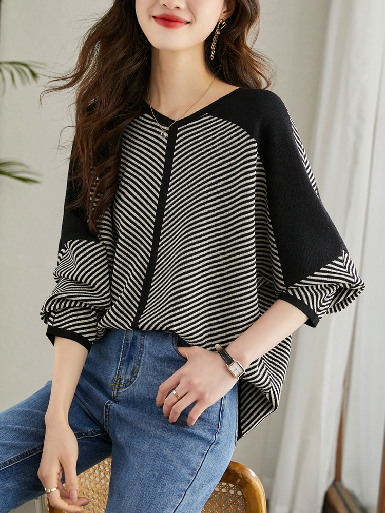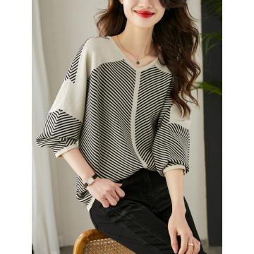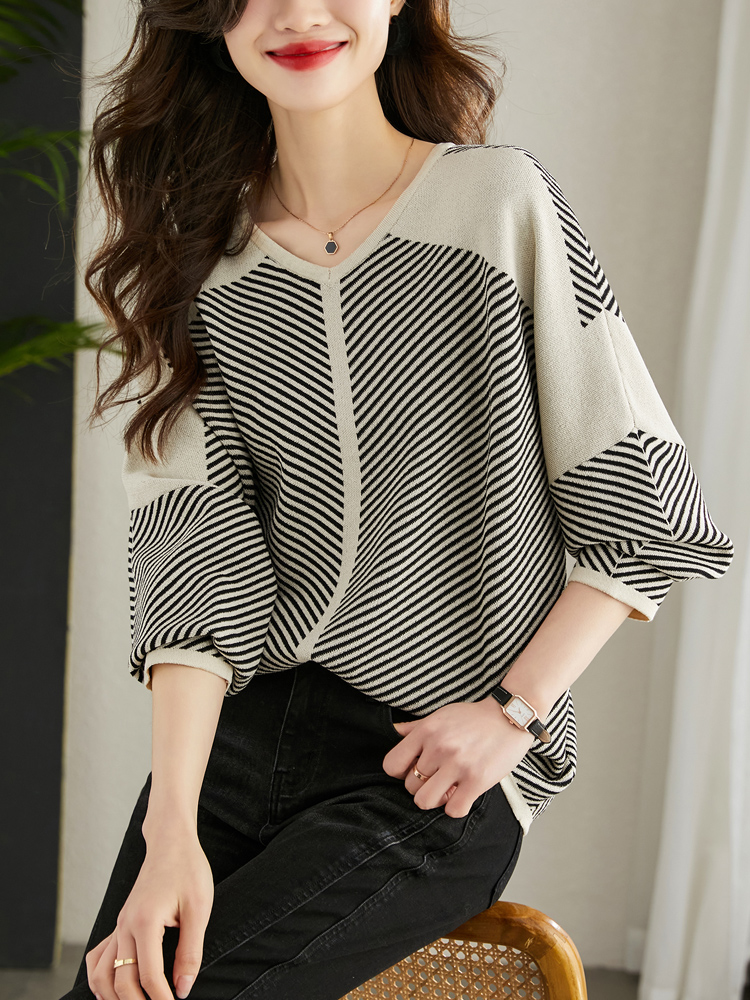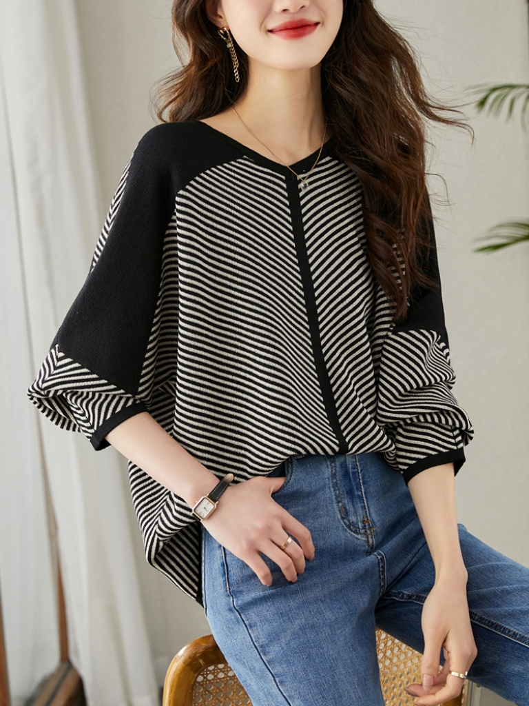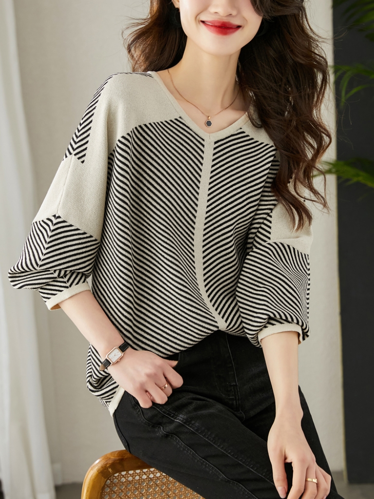 FA48534# 条纹女春秋季新款时尚宽松遮肚洋气漂亮小衫长袖打底衫上衣 服裝批發女裝批發服飾貨源