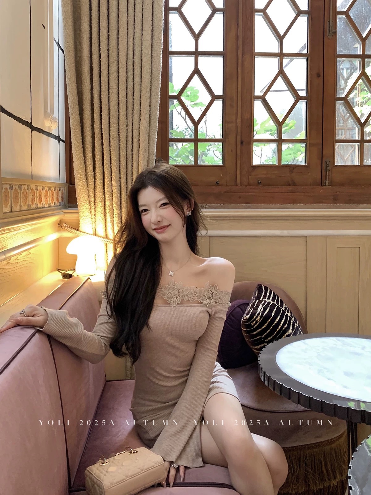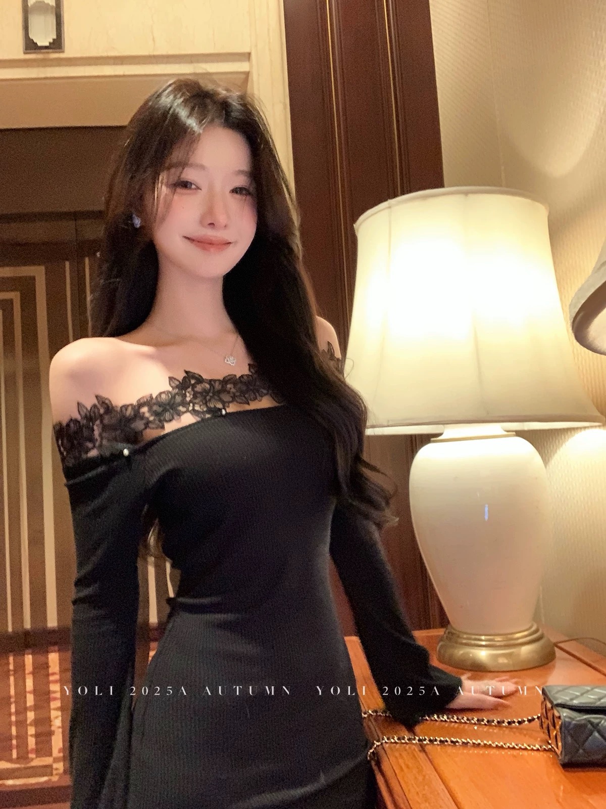 FA48915# 黑色蕾丝拼接长袖连衣裙女冬修身显瘦短裙 服裝批發女裝批發服飾貨源