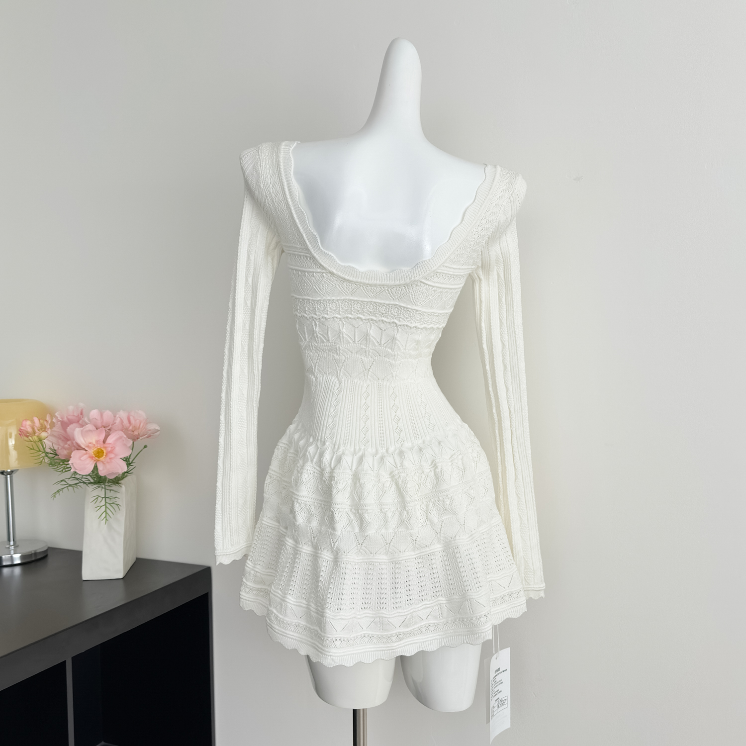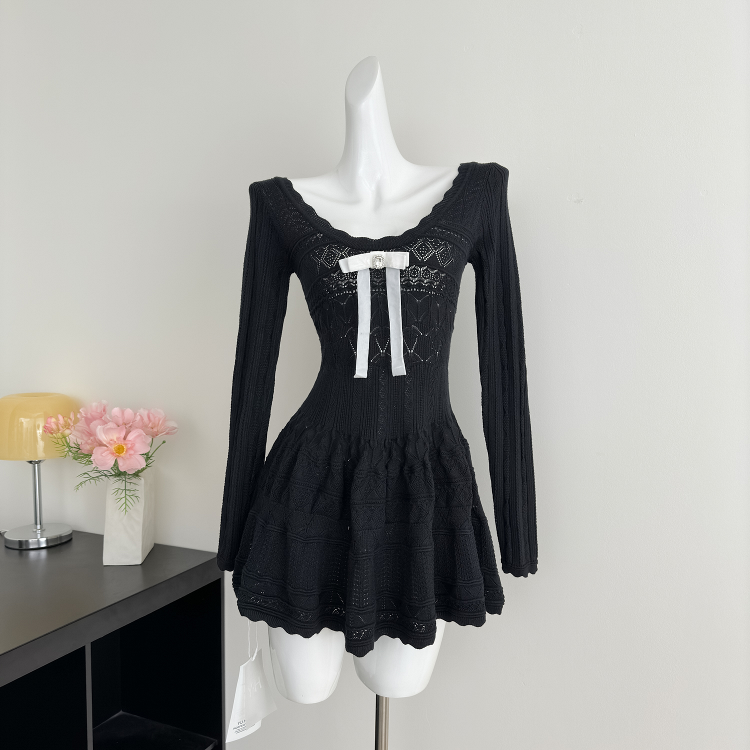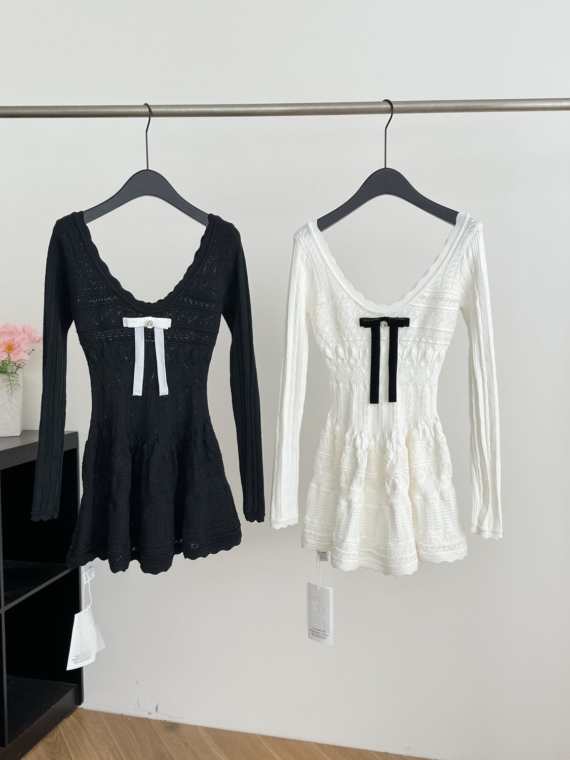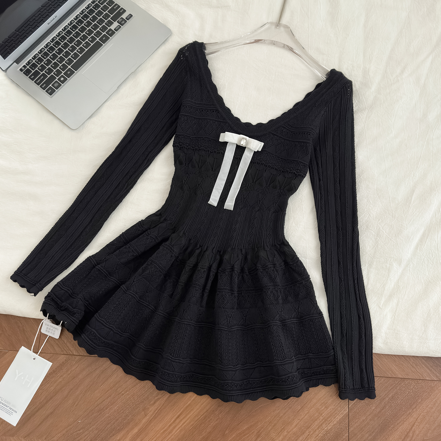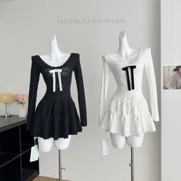 FA48925# 千金感miu系连衣裙女白月光韩系蝴蝶结长袖针织小白裙 服裝批發女裝批發服飾貨源